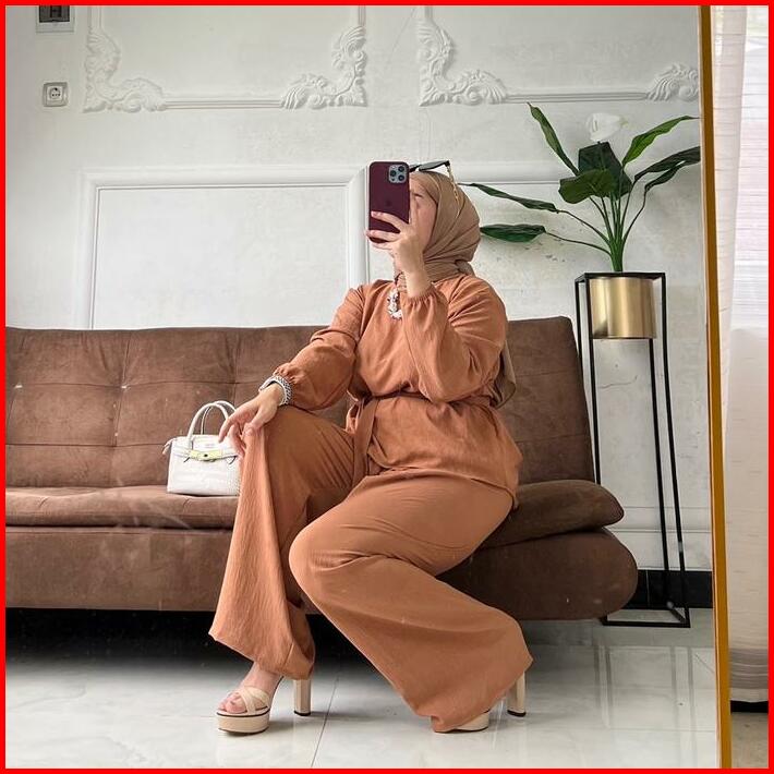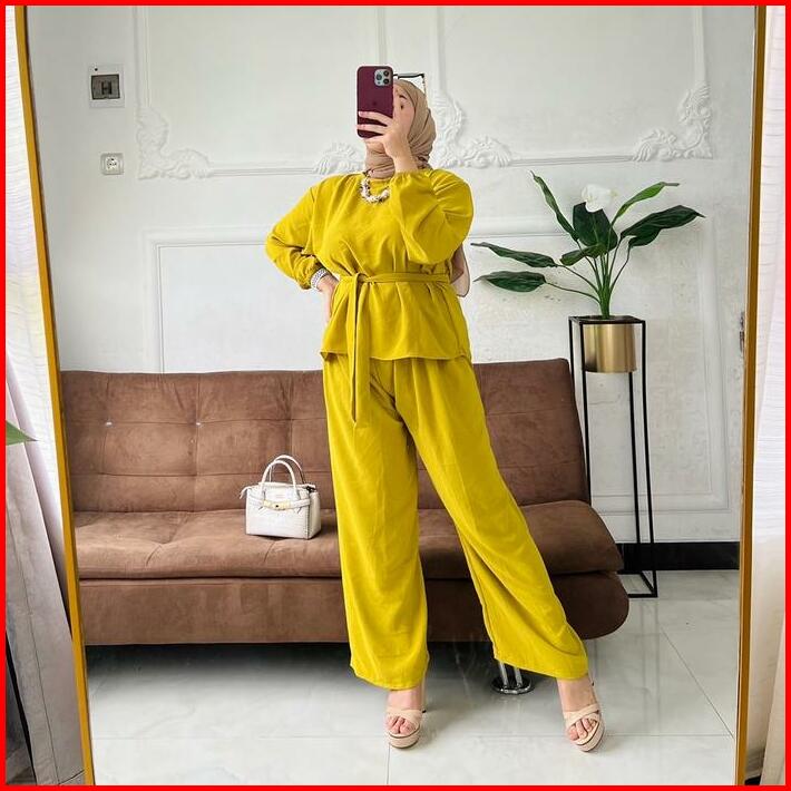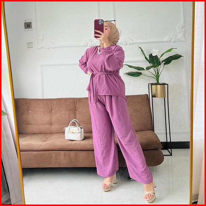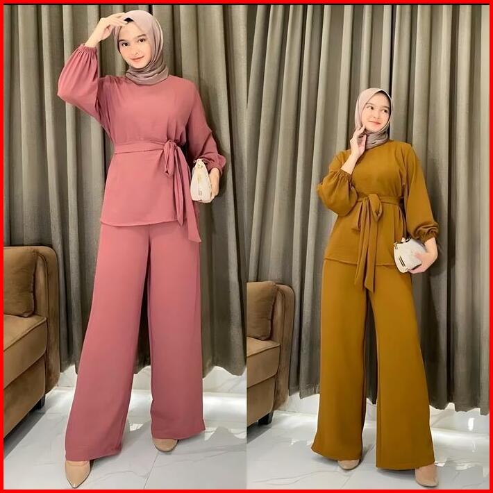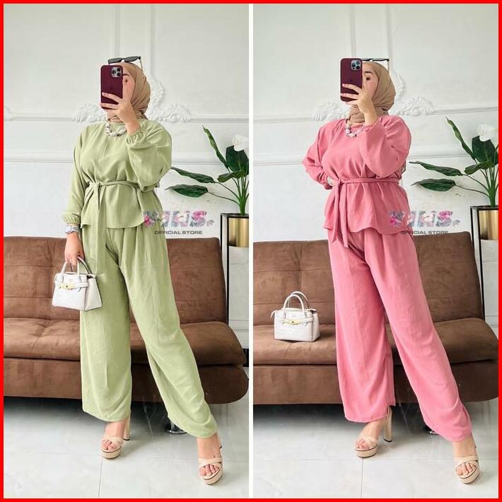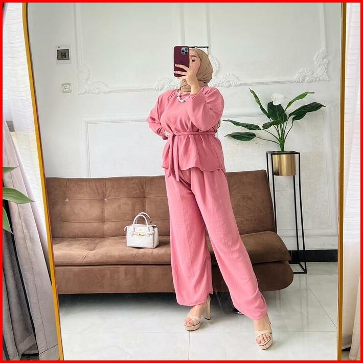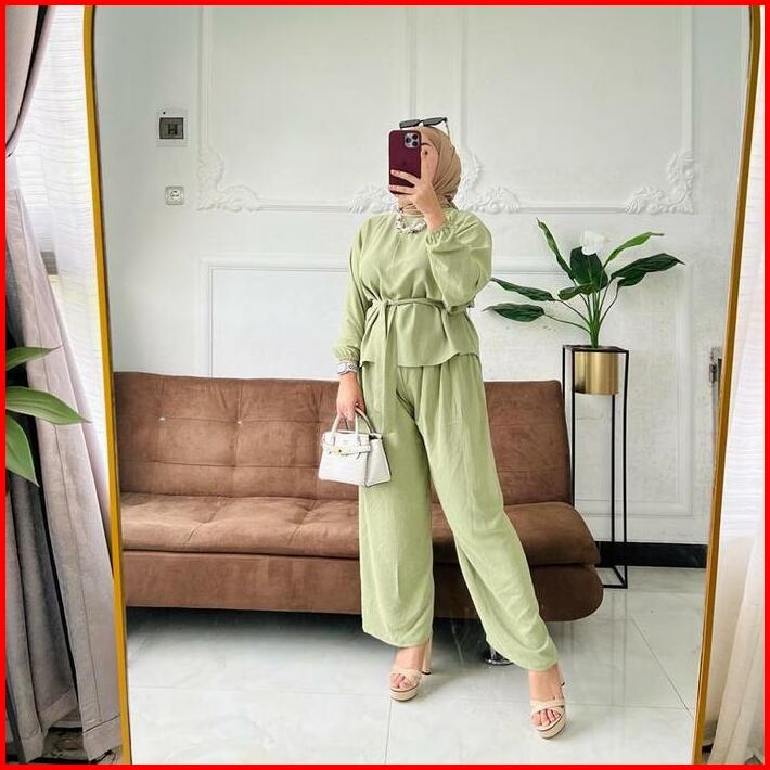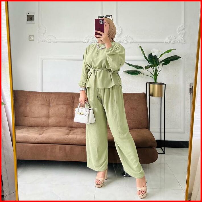 Moana One Set Crincle Airflow Premium Free Belt Celana Kancing Crinkle Setelan Wanita