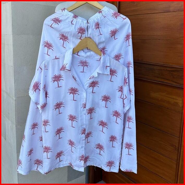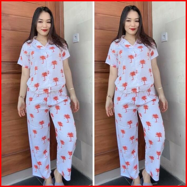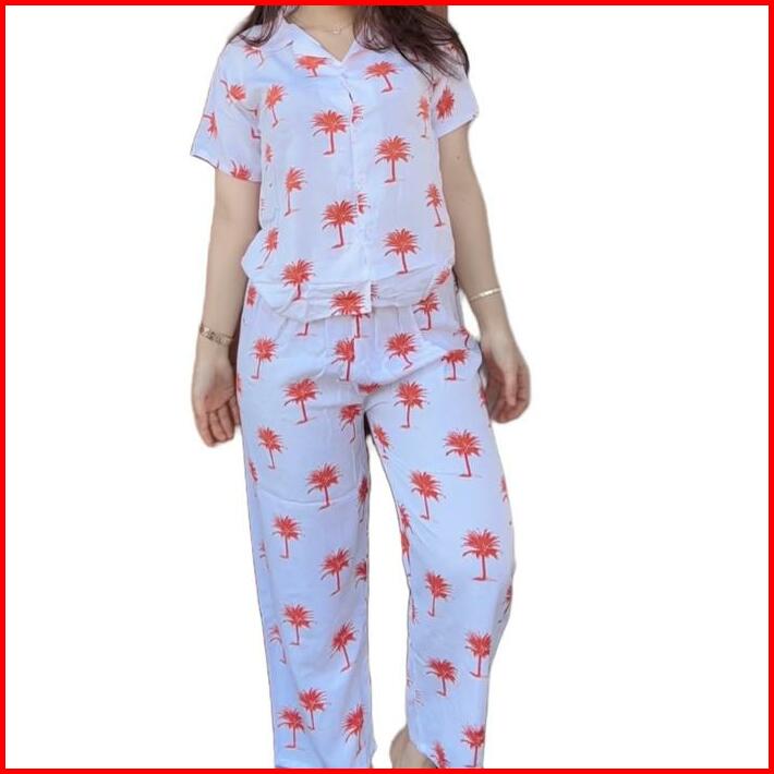 Baju Tidur Wanita Dewasa Motif Kelapa Set Wanita Rayon Piyama Kancing Kekinian Celana Panjang Lembut Nyaman Santai Setel