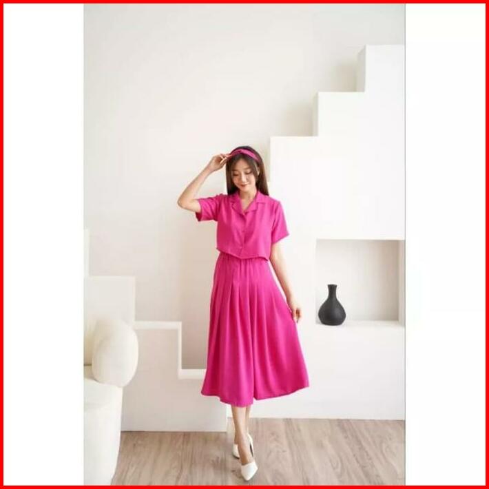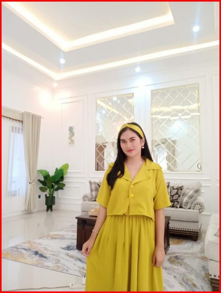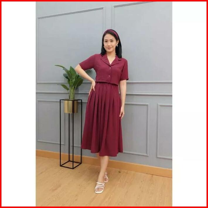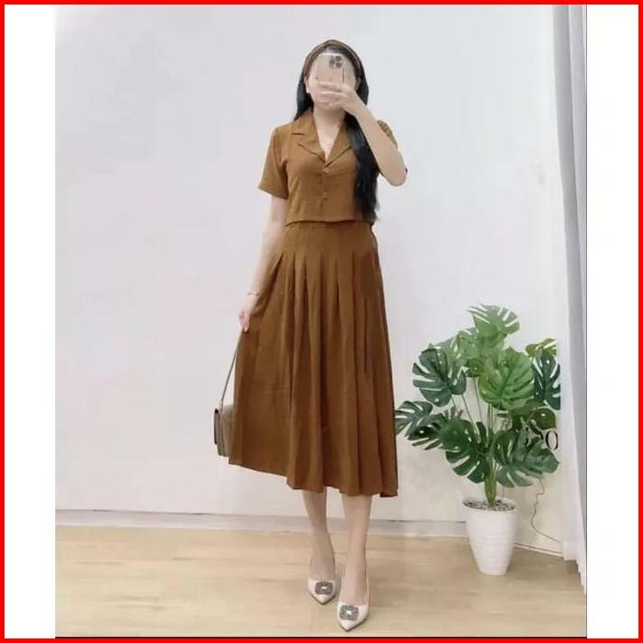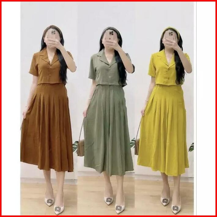 One Set Giya Crinkle Free Bando Atasan Baju Kemeja Crop Dan Rok Midi 2 In 1 Wanita Dewasa