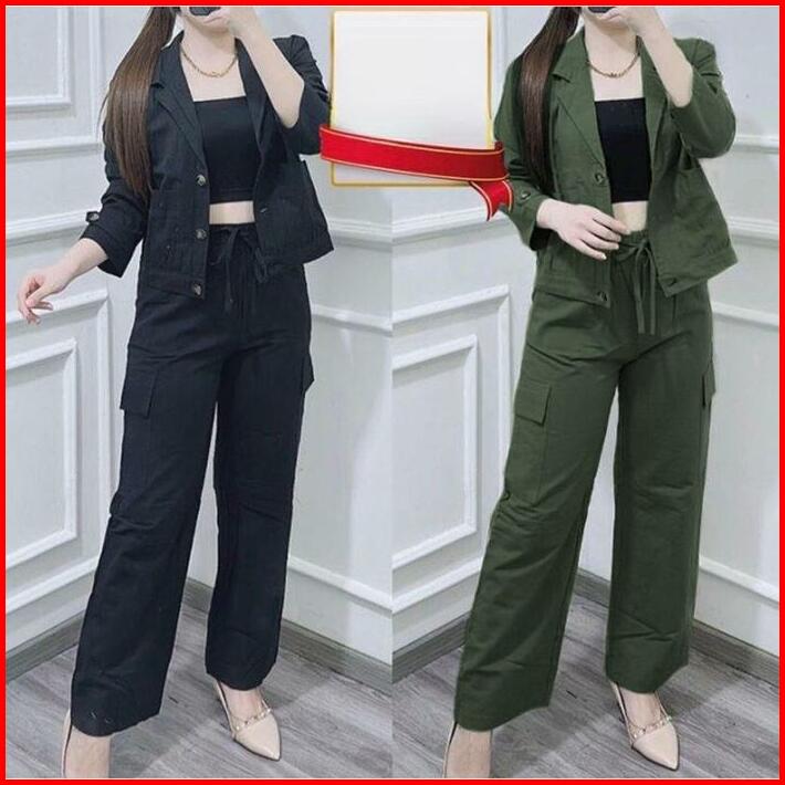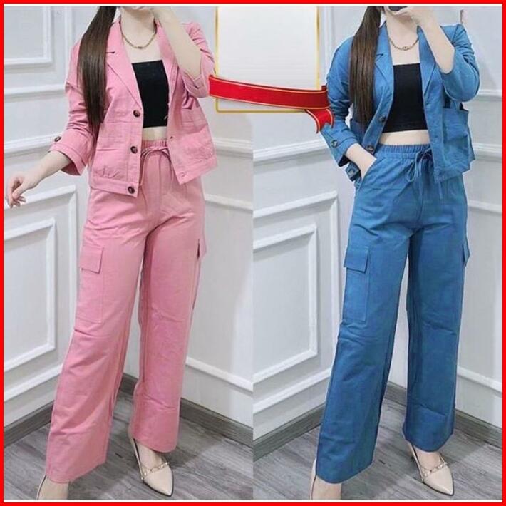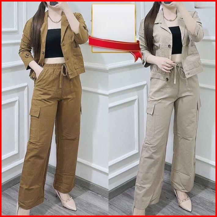 Baru Carla Set Linen Rami Oneset Outercrop Celana Cargo Setelan Wanita Kasual 2024 Jsf