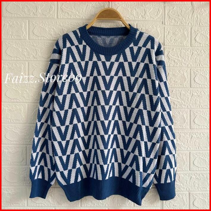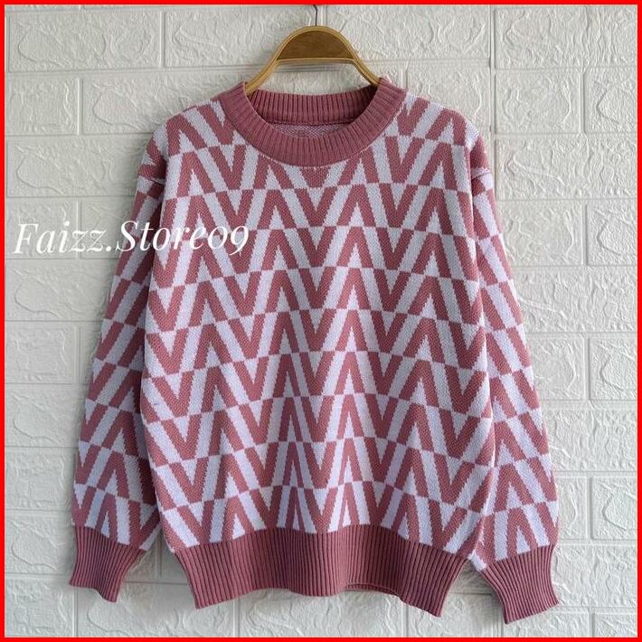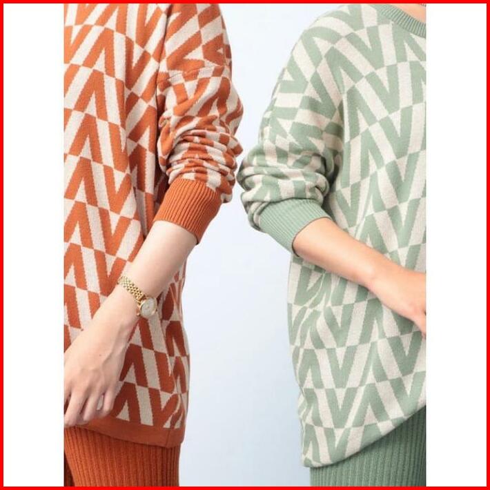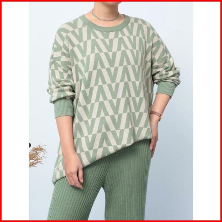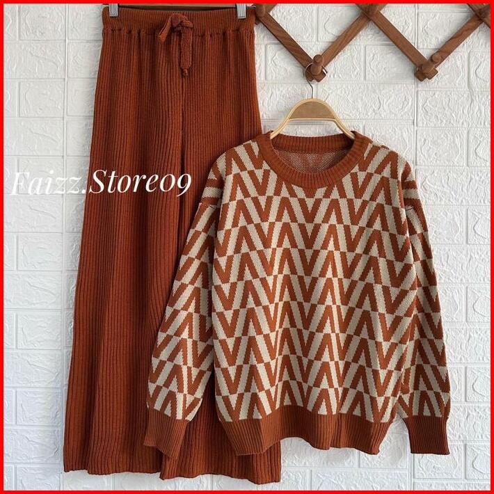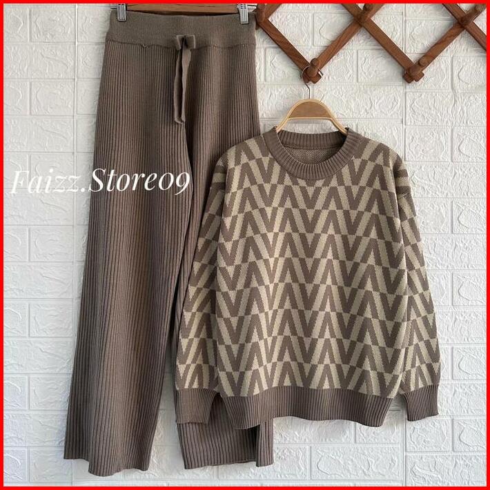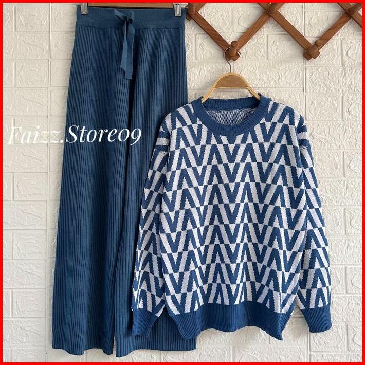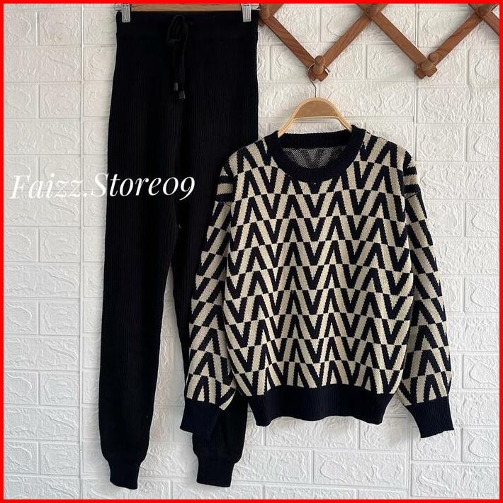 Oneset Giva Rajut Knist Import Motif V Setelan Celana Kulot Dan Joger Fit Panjang