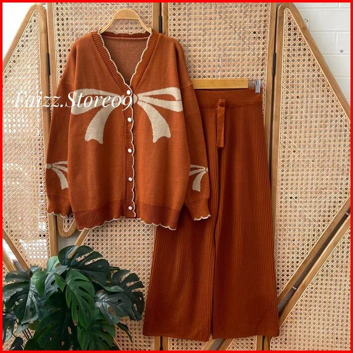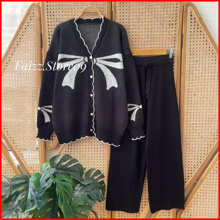 Oneset Ribbon Cardigan Rajut Motif Pita Setelan Celana Kulot Premium Wanita Lengan Panjang Wanita Kekinian Atasan Baju K