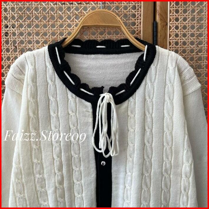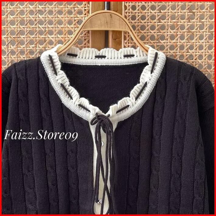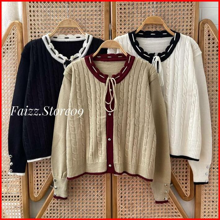 Vela Cardigan Rajut Tali Pita Motif Cable Lengan Panjang Wanita Kekinian Outer Atasan Kardigan Knitwear