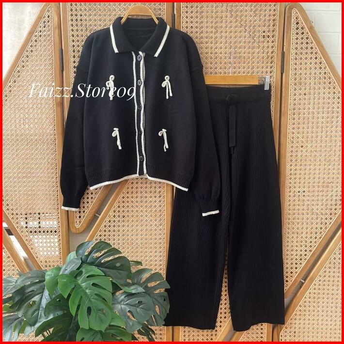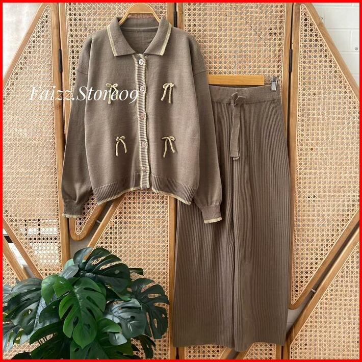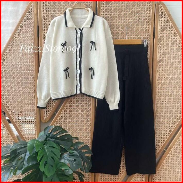 Oneset Ciko Cardigan Rajut Motif Pita Setelan Celana Kulot Premium Wanita Lengan Panjang Kekinian Atasan Baju Dewasa