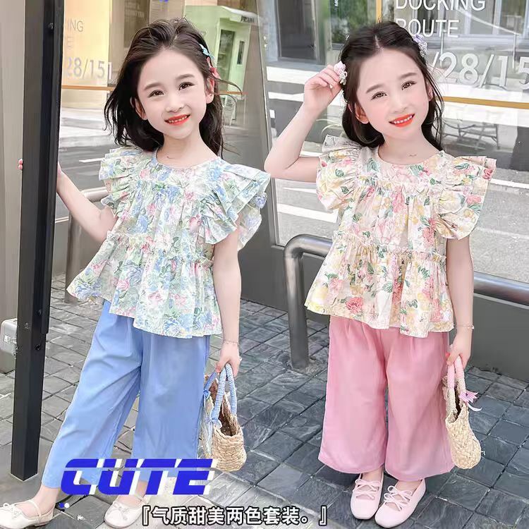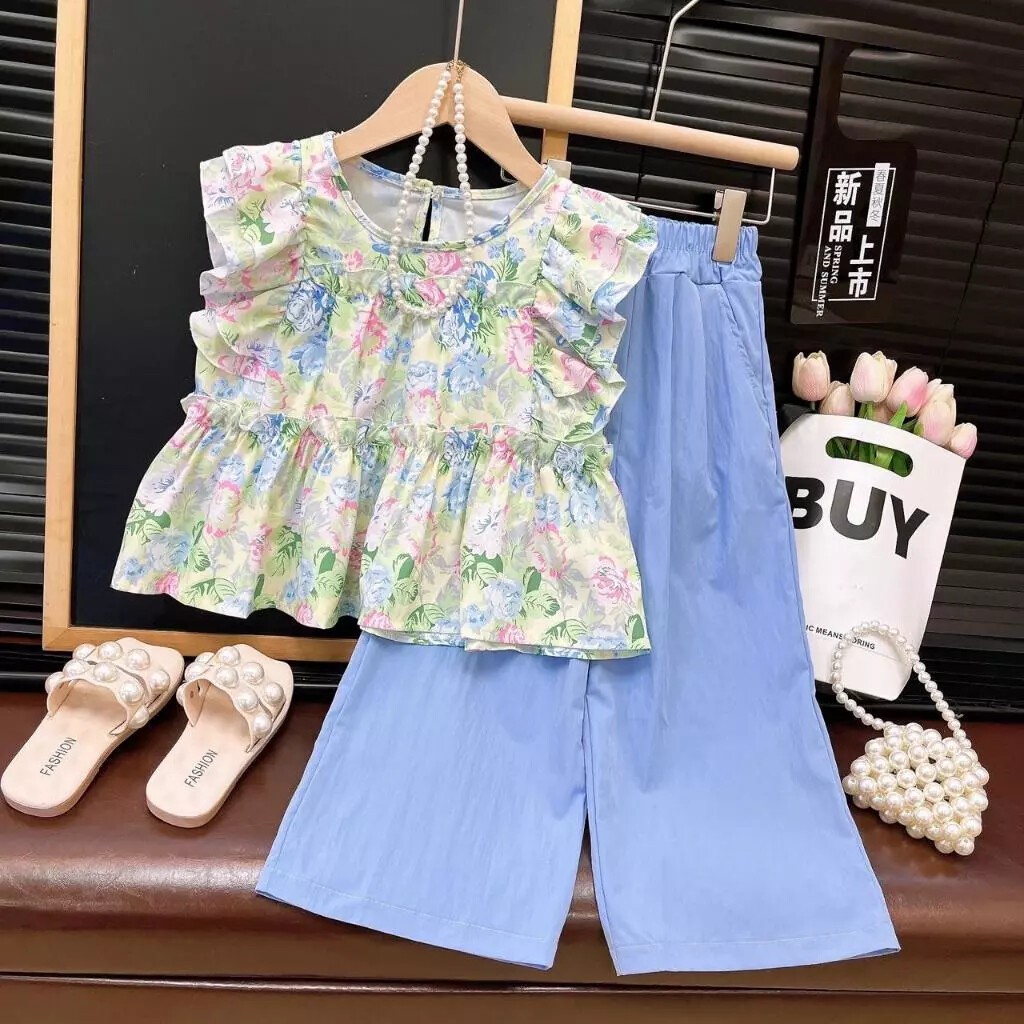 setelan bunga lengan panjang ruffle kerut celana kulot anak perempuan usia 1-5thn baju setelan anak