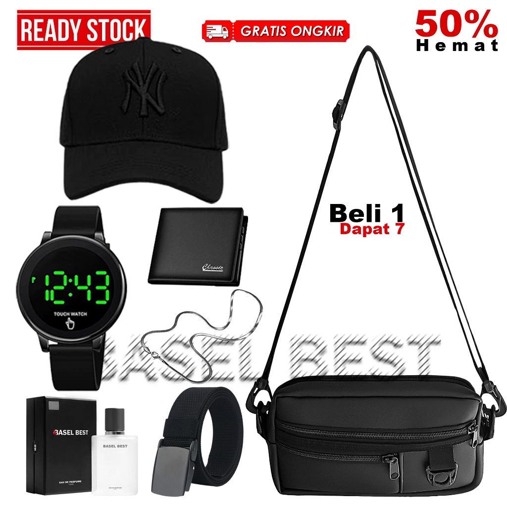 PROMO BAGI PELAJAR & PEKERJA TERMURAH PAKET BUNDLING 5 IN 1 & 4 IN 1 SLING BAG PRIA TAS SELEMPANG COWOK TOPI BASEBALL JAM TANGAN PRIA IKAT PINGGANG & DOMPET / PAKETAN