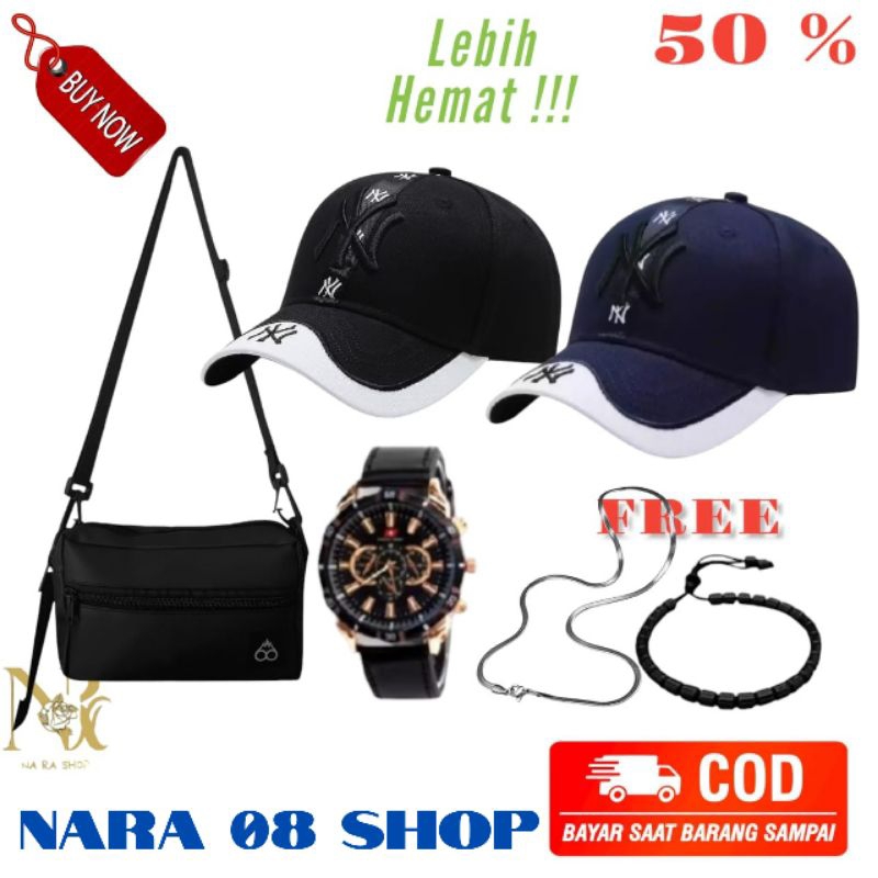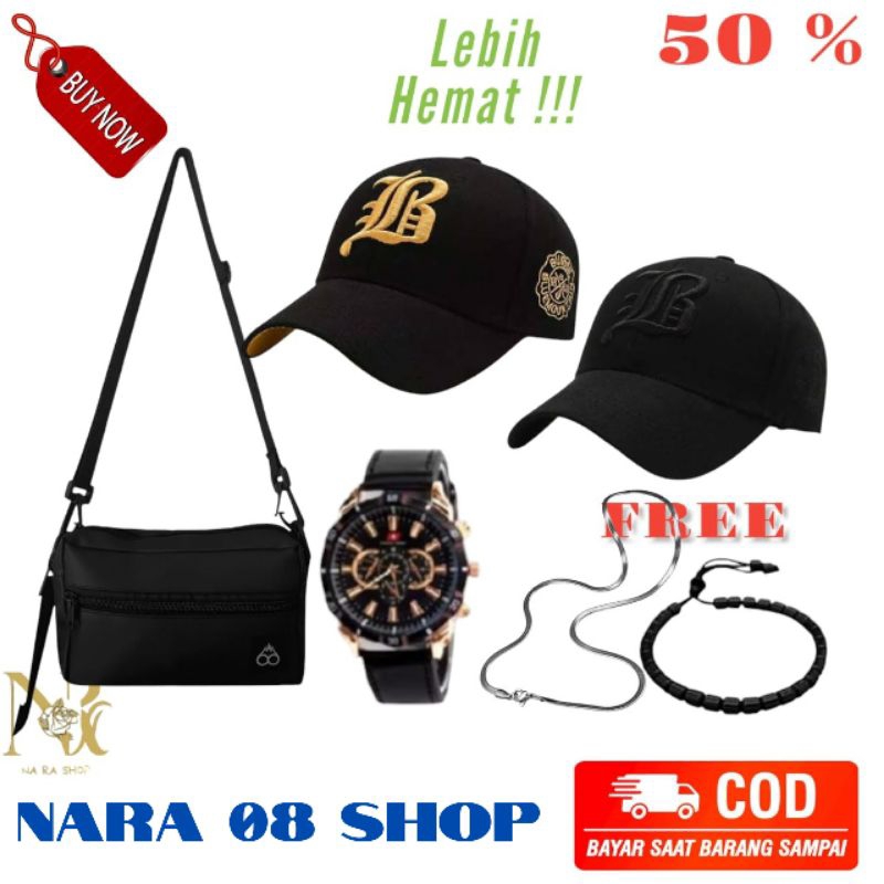 PAKET DUO KECE 6 IN 1.TAS SELEMPANG PRIA SLING BAG/WAIST BAG TOPI DISTRO/BASEBALL BORDIR JAM TANGAN FREE KALUNG TITANIUM & GELANG.