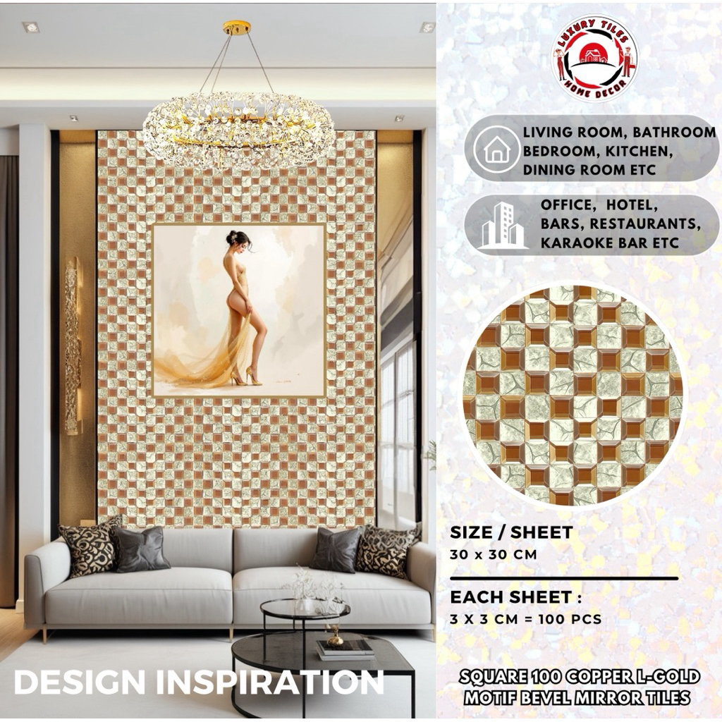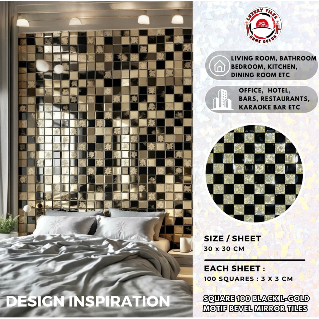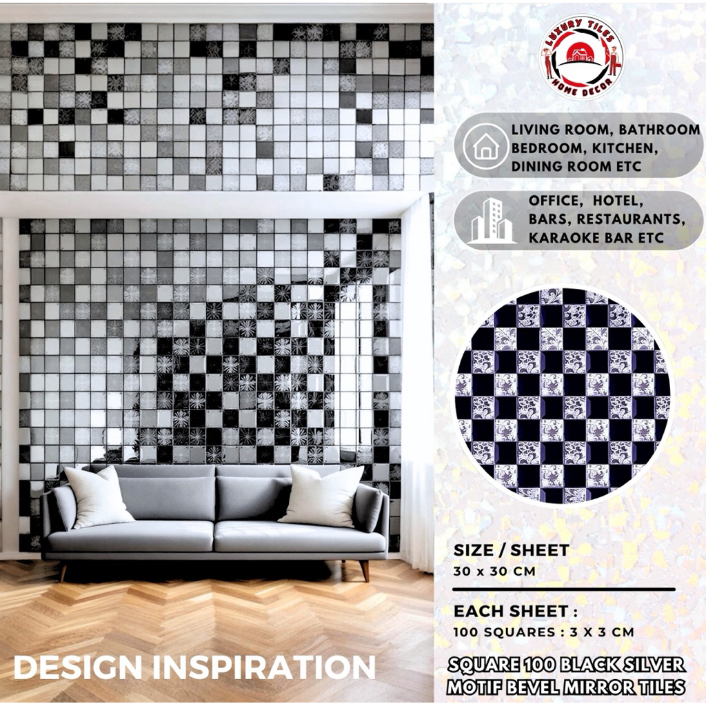 9 PILIHAN KERAMIK CERMIN DINDING 100 SQUARE ENGRAVED MOTIF MIRROR BEVEL TILES KACA DEKOR MEWAH WALL