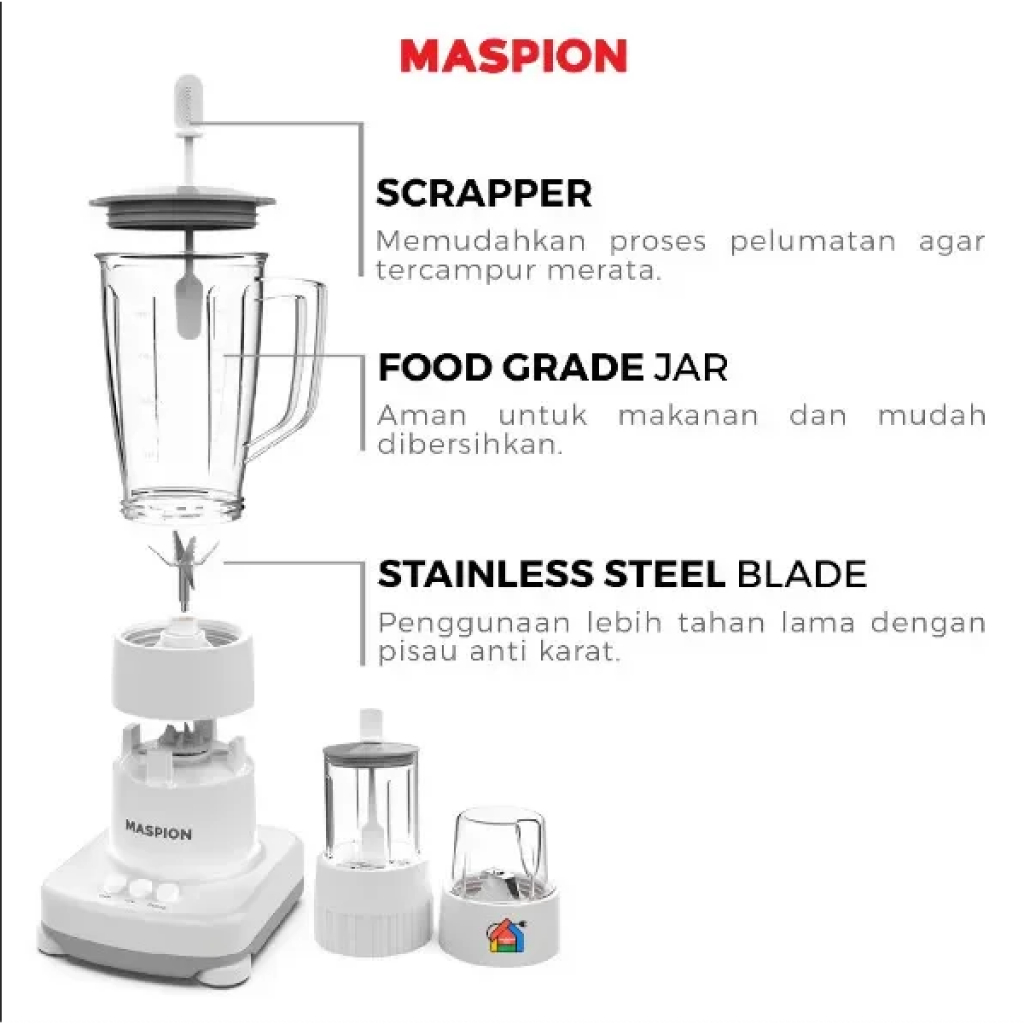 BLENDER MASPION PELUMAT PLASTIK WITH WET MILLER AND DRY MILLER 1 LITER MT-1273 PL 3 IN 1 MT1273 ORIGINAL