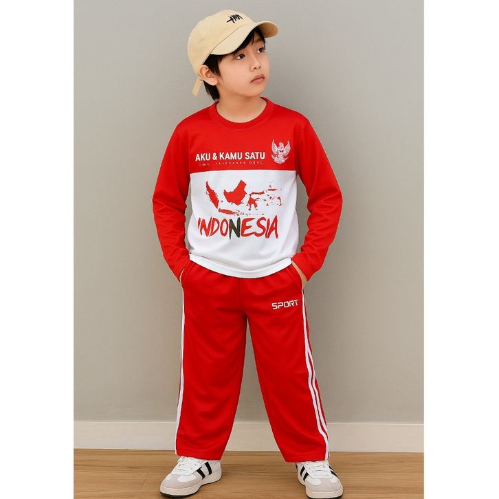Baju Dirgahayu Anak Setelan Baju Merah Putih Bahan Katun Lengan Panjang Celana Training Ready Usia Anak 5-10 Tahun