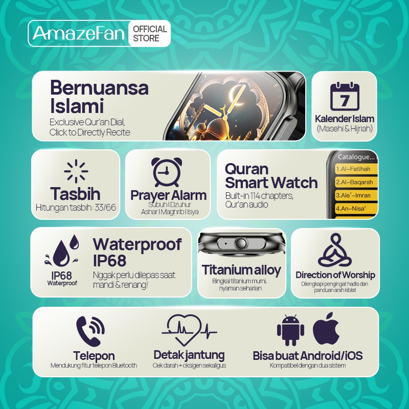 SMARTWATCH MUSLIM PREMIUM - TITANIUM, IP68, AUDIO QURAN 114 SURAH, TASBIH DIGITAL, ALARM SHALAT, KALENDER HIJRIAH, DETEKSI KESEHATAN, HADIAH LEBARAN