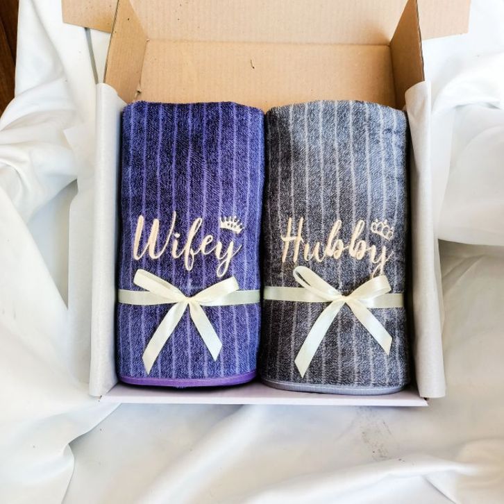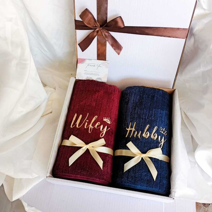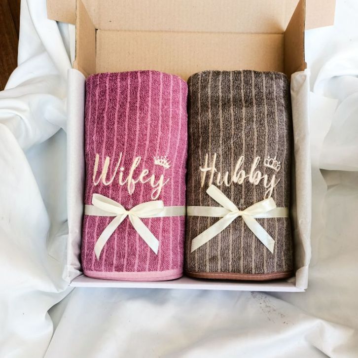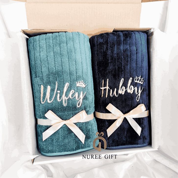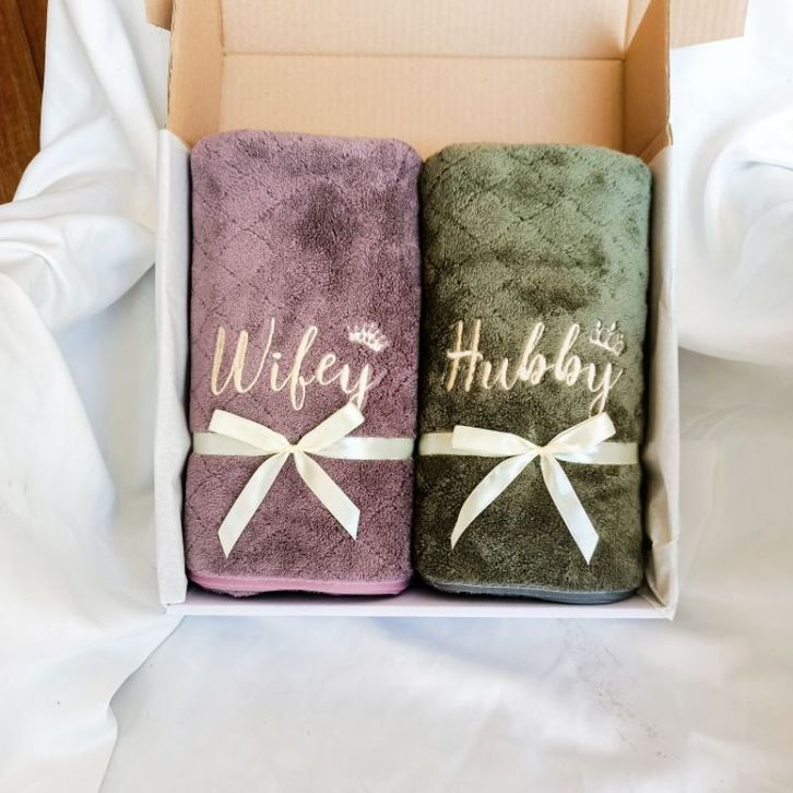 Best Wedding Gift Handuk Couple Extrasoft 70x140cm Wifey Hubby by Nuree Bordir Kado Pernikahan Pasangan