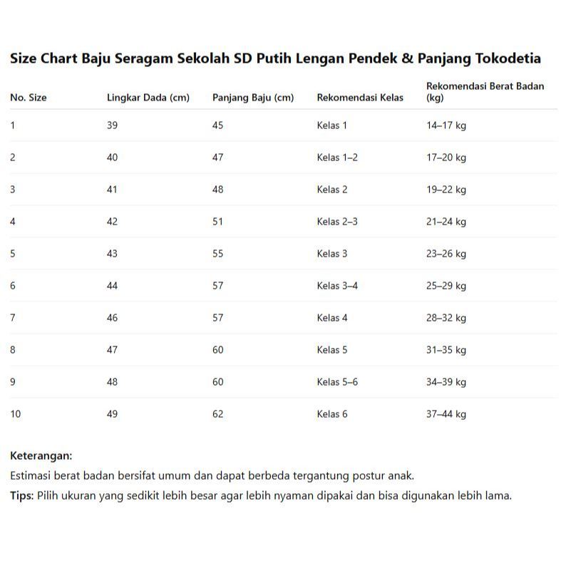 Baju Seragam Sekolah SD Putih Lengan Pendek & Panjang Katun Oxford / Tetoron TC