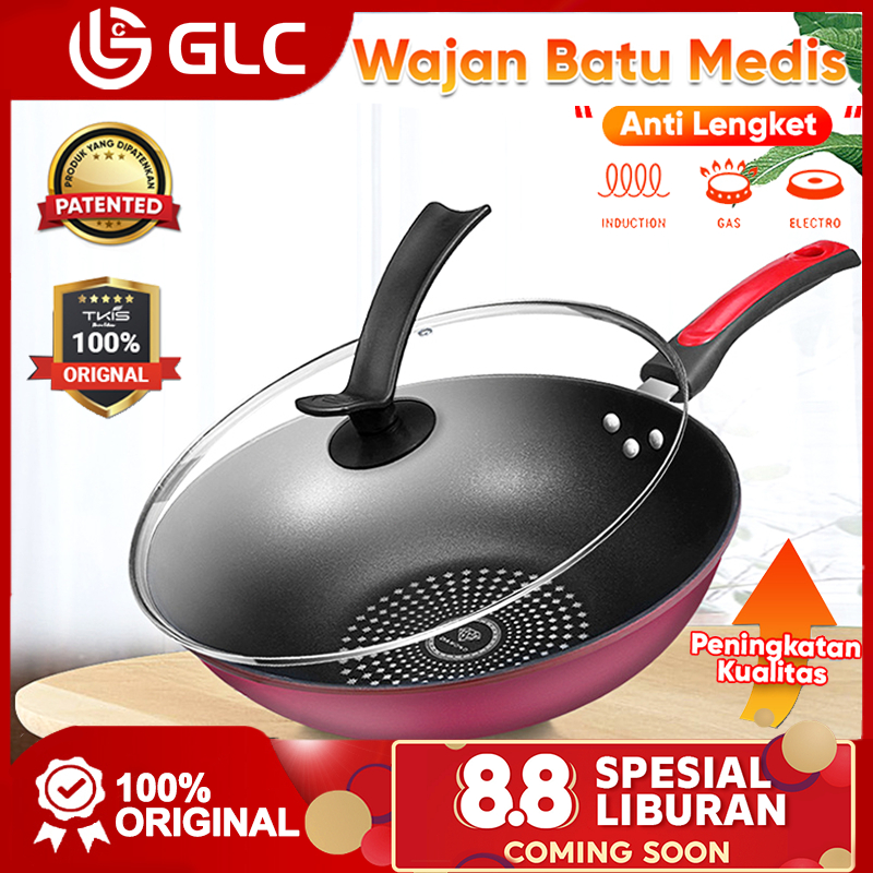 Diamond Wok Pan Tutup Kaca Wajan Penggorengan Anti Lengket Batu Medis Ukuran 32cm | Wokpan dengan tutup kaca