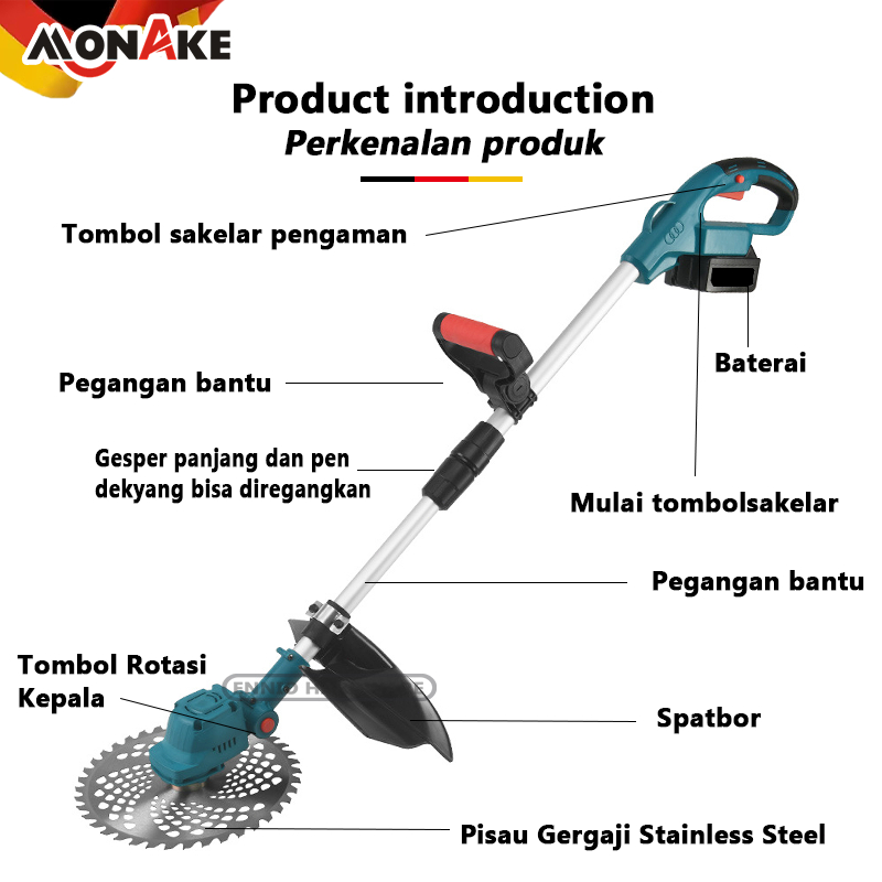 Mesin Potong Rumput MONAKE Alat Jerman Brushless 9 inch Pemotong Rumput Listrik Pemangkas Cordless