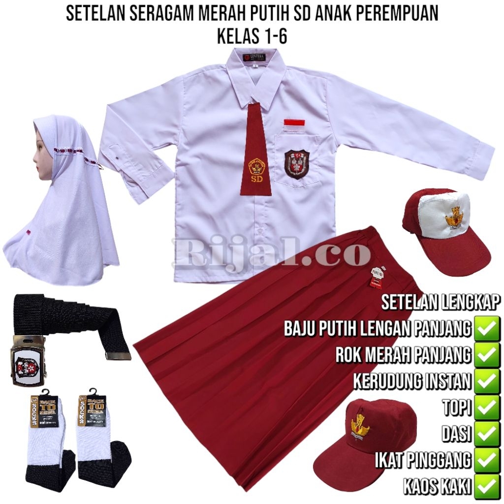 setelan seragam merah putih sekolah SD anak perempuan baju lengan panjang rok merah panjang