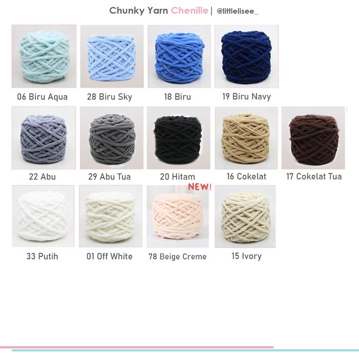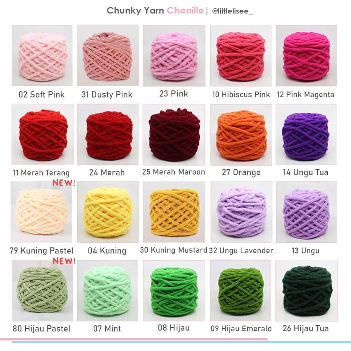 01 Off White, 02 Soft Pink, 04 Kuning, 06 Biru Aqua, 07 Mint, 08 Hijau, 09 Hijau Emrald, 10 Hbscus Pink, 11 Merah Terang, 12 Pink Magenta, 13 Ungu, 14 Ungu Tua, 15 Ivory, 16 Coklat, 17 Coklat Tua, 18 Biru, 19 Biru Navy, 20 Hitam, 22 Abu, 23 Pink, 24 Merah, 25 Merah Maroon, 26 Hijau Tua, 27 Orange, 28 Biru Sky, 29 Abu tua, 30 K. Mustard, 31 Dusty Pink, 32 Ungu lvnd, 33 Putih, 78 Beige Creme, 79 Kuning Pastel, 80 Hijau Pastel
