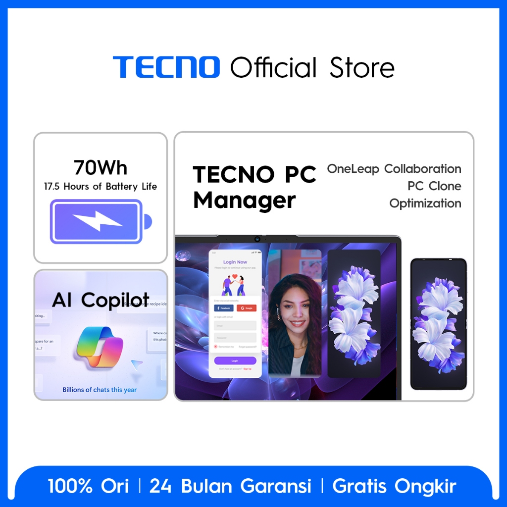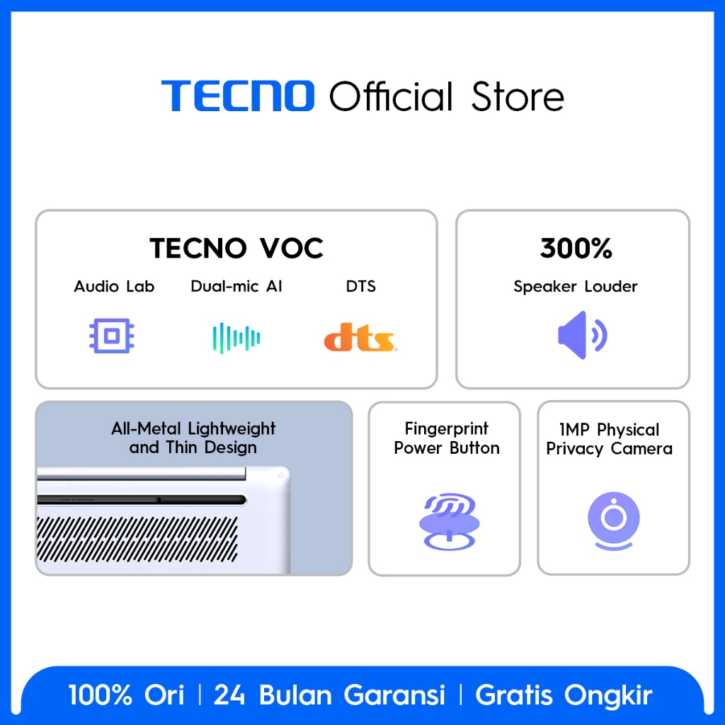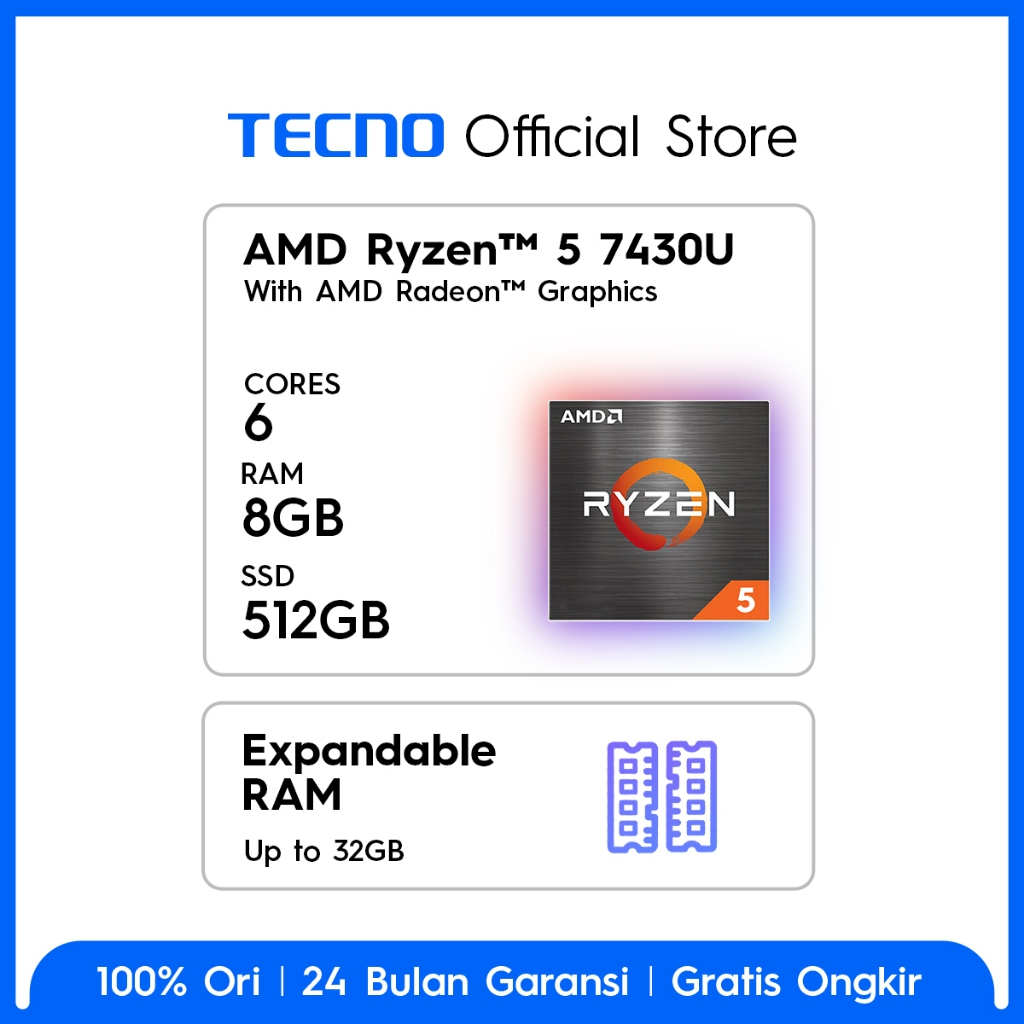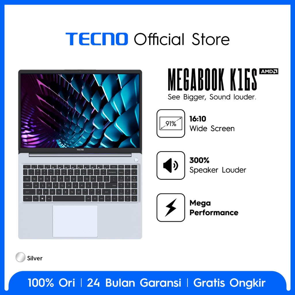 TECNO MEGABOOK K16S – 8+512GB, AMD Ryzen 5 – 7430U Processor, 70Wh Battery up to 17.5hours, 65Watt Fast Charging, 1.75kg , Garansi 24 Bulan