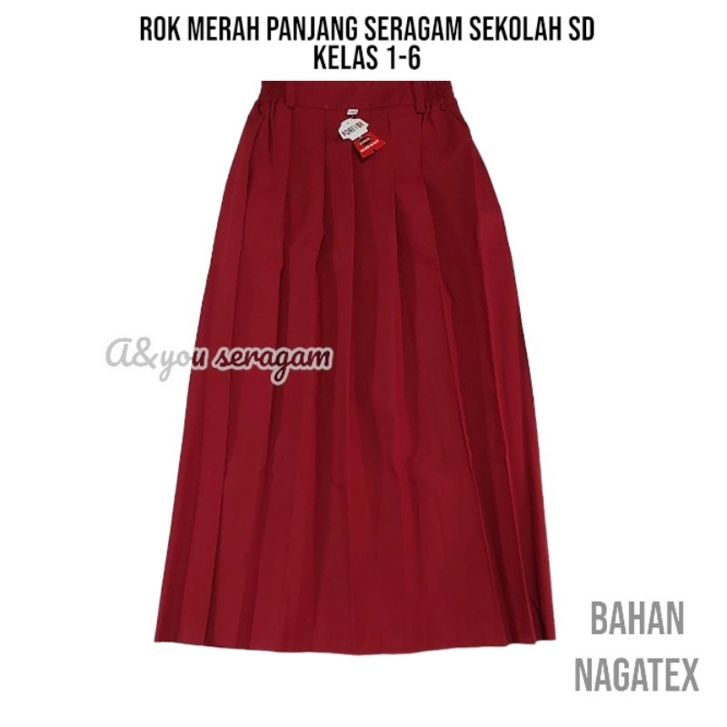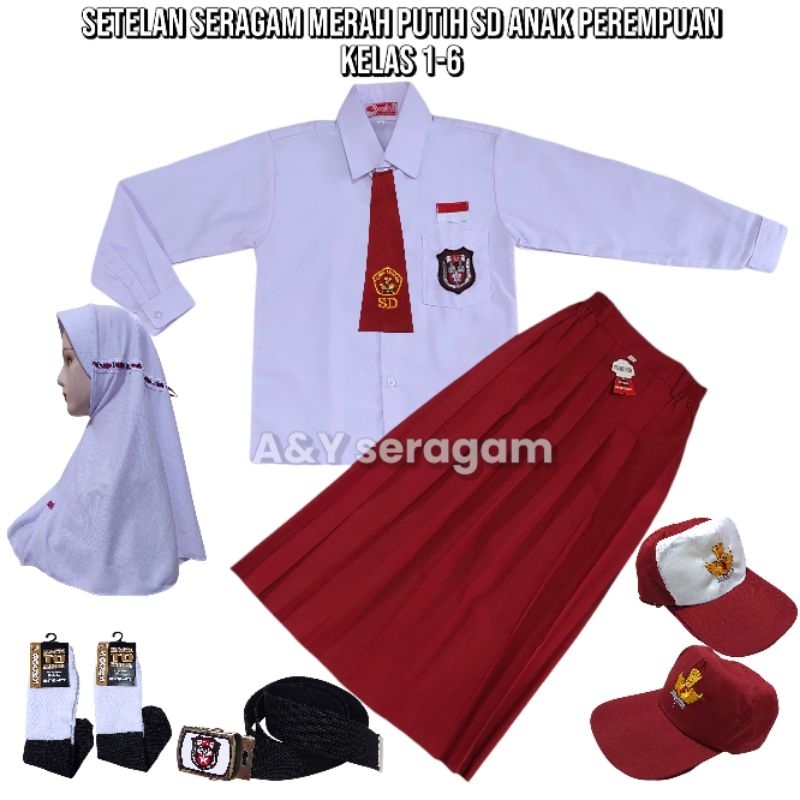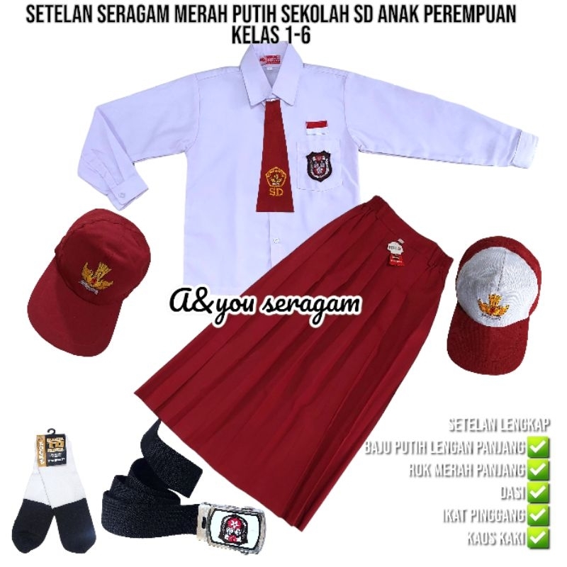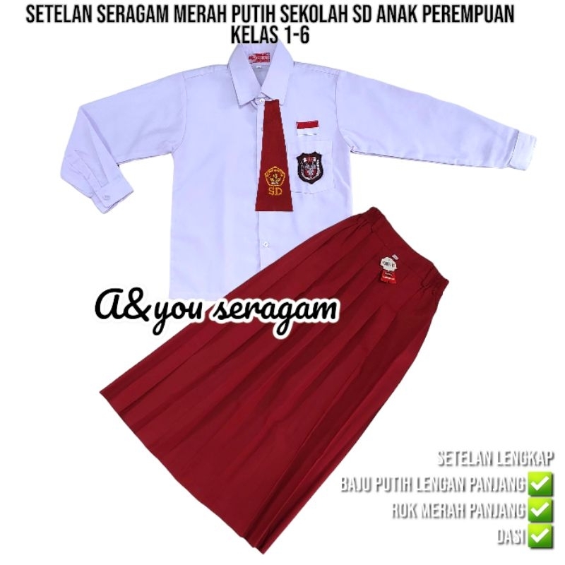 setelan lengkap seragam merah putih sekolah SD anak perempuan baju lengan panjang rok merah panjang