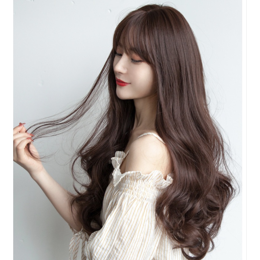 Wig rambut panjang curly 70cm poni untuk wanita gelombang besar alami rambut keriting panjang elegan