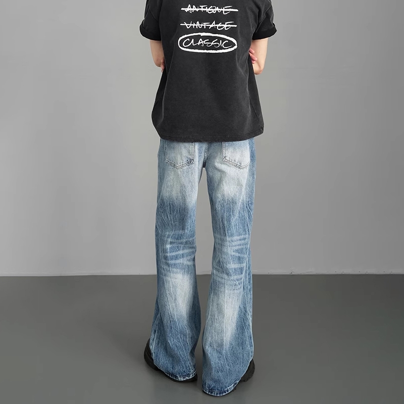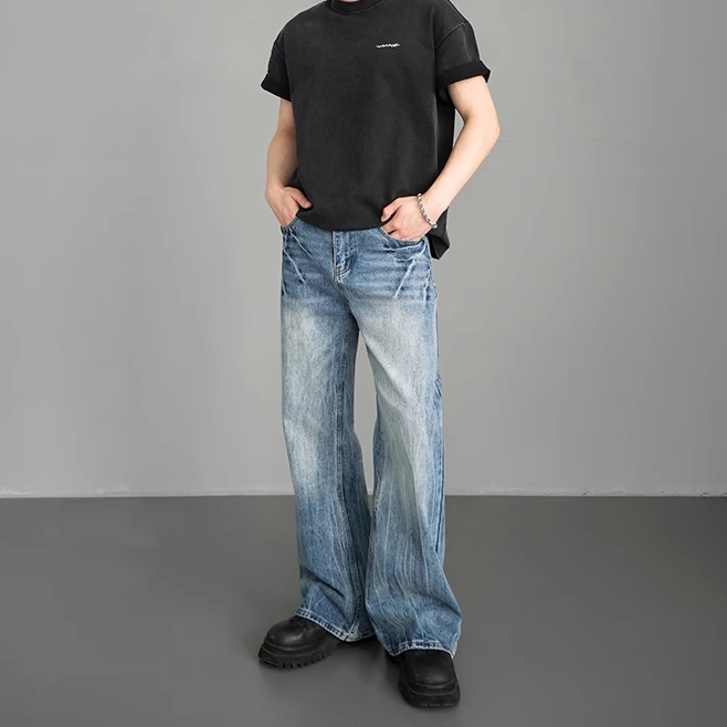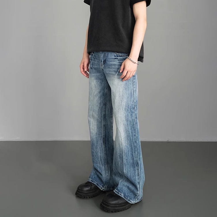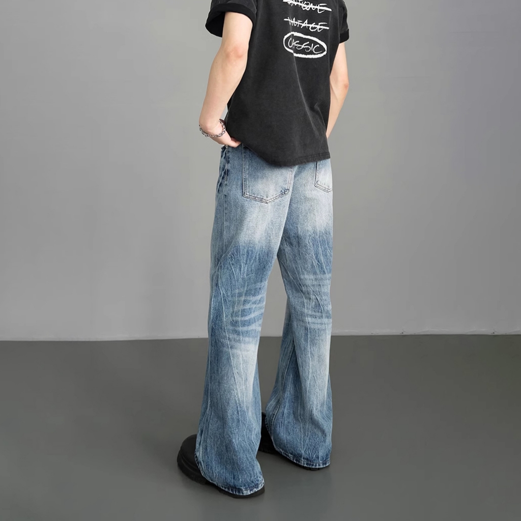 Celana Jeans Pria Tren 2025 Korean Kekinian - Biru Teknik Jacquard & Retakan Petir Washed, Cut Boot Lurus Gaya Distro