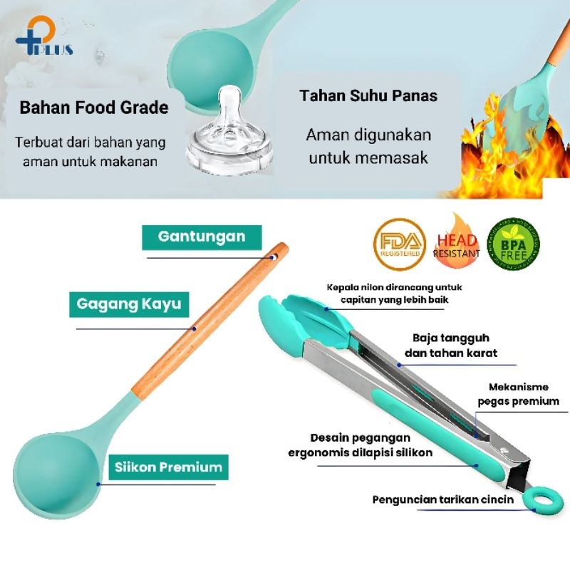 [ Pplus ] Spatula Silicone Set 11Pcs+Wadah / Spatula Silikon anti lengket tahan panas / Spatula Peralatan Masak Sutil Pegangan Kayu Baking Set Alat Masak 11 pcs