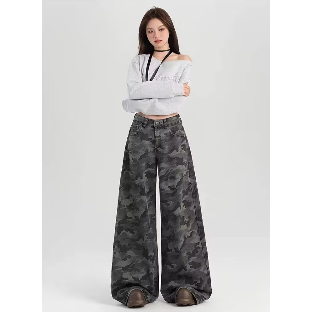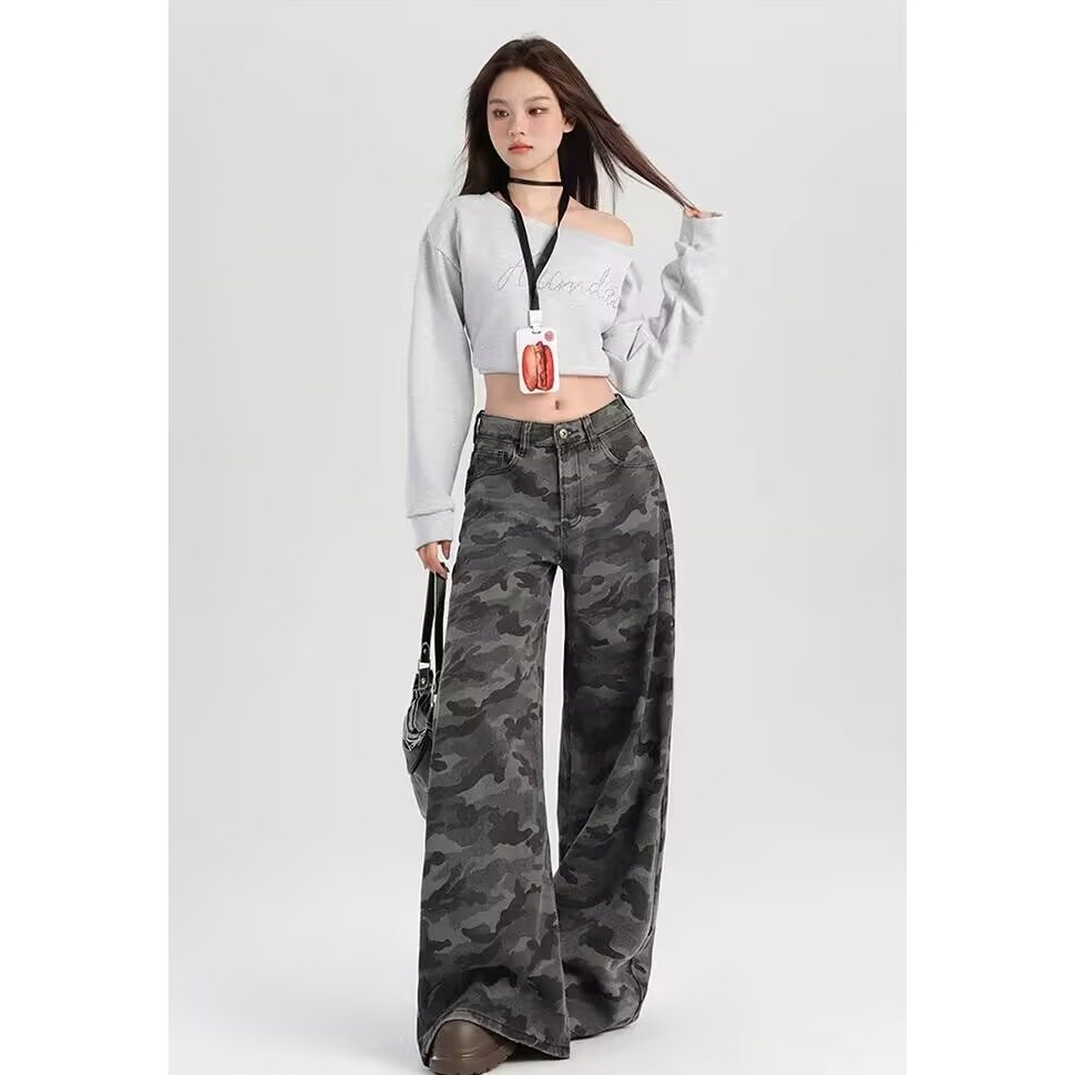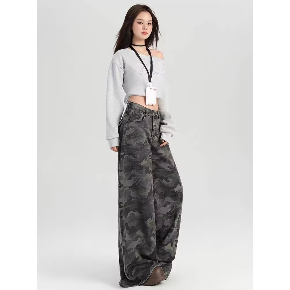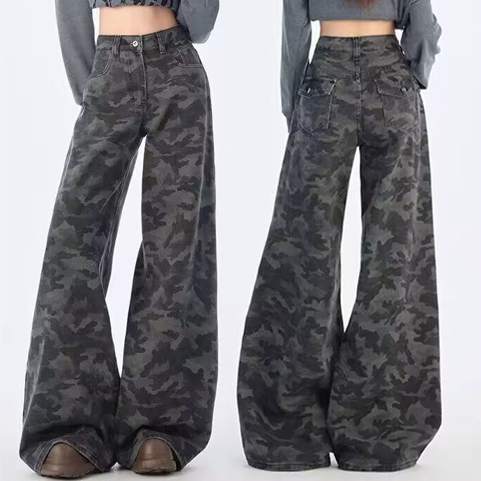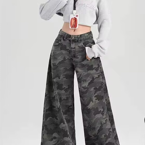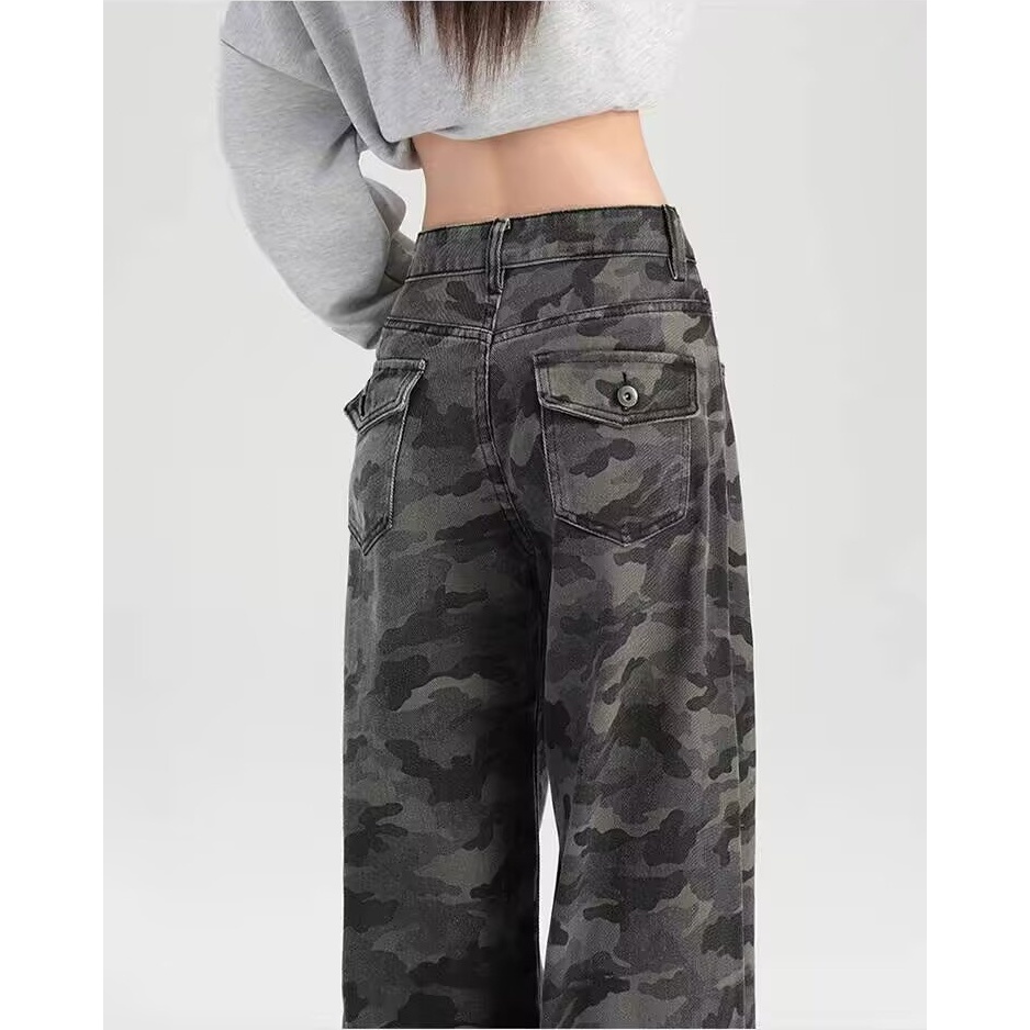KATERMEN Jeans kamuflase wanita gaya pinggang tinggi pakaian kerja kaki lebar celana jeans lurus