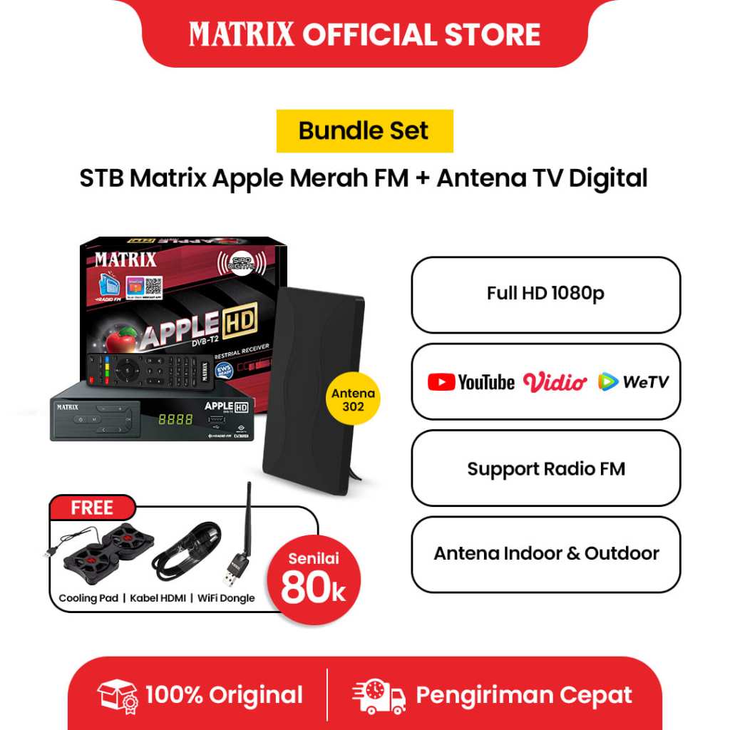 BUNDLE MATRIX SET T0P BOX APPLE MERAH DVBT2 (RADIO FM) + ANTENA TV DIGITAL HD 302