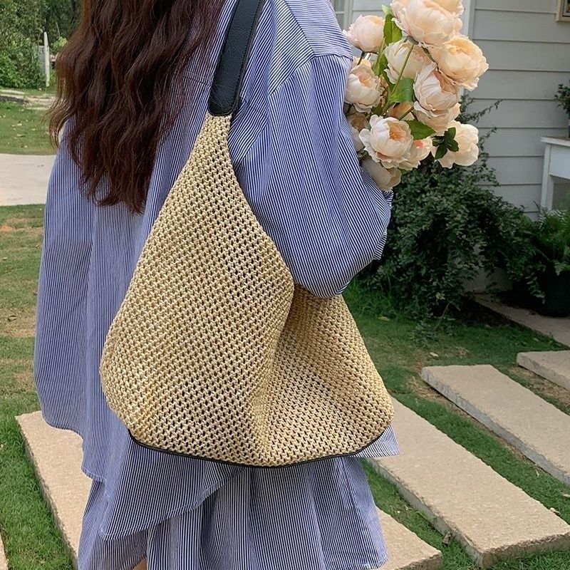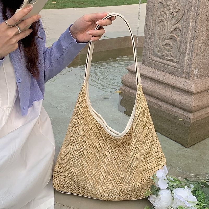 Tas Anyaman Pantai Gaya Liburan Tas Anyaman Bahu Tas Fashion Wanita Tote Tas Ketiak Jerami Berlubang Tas Bahu Kapasitas