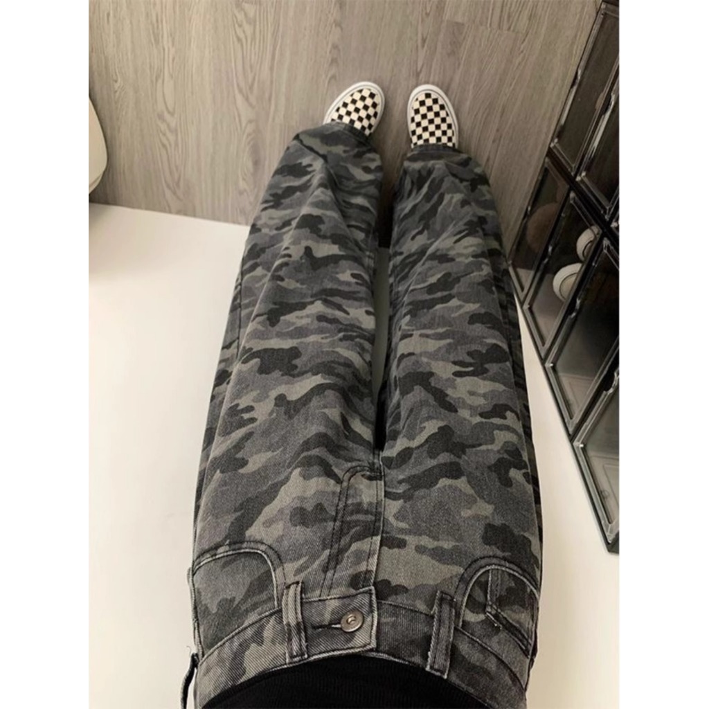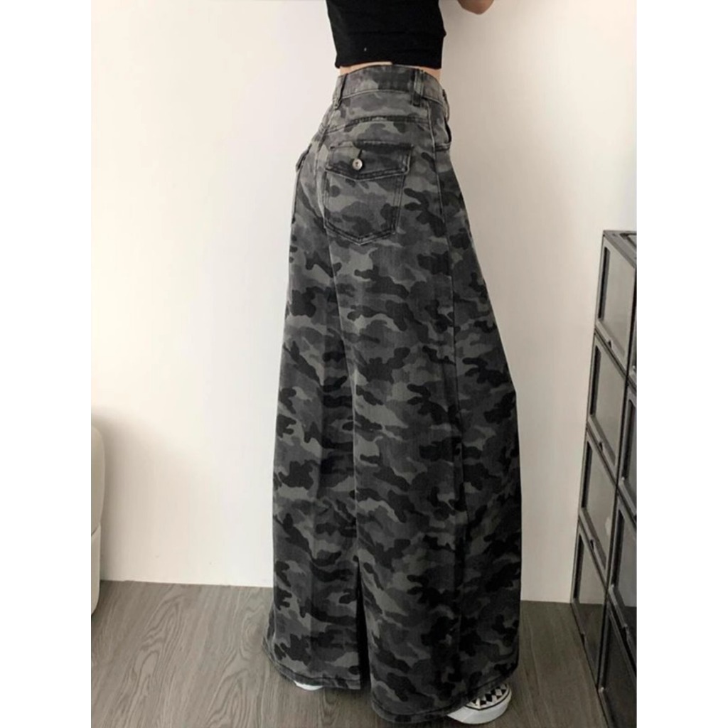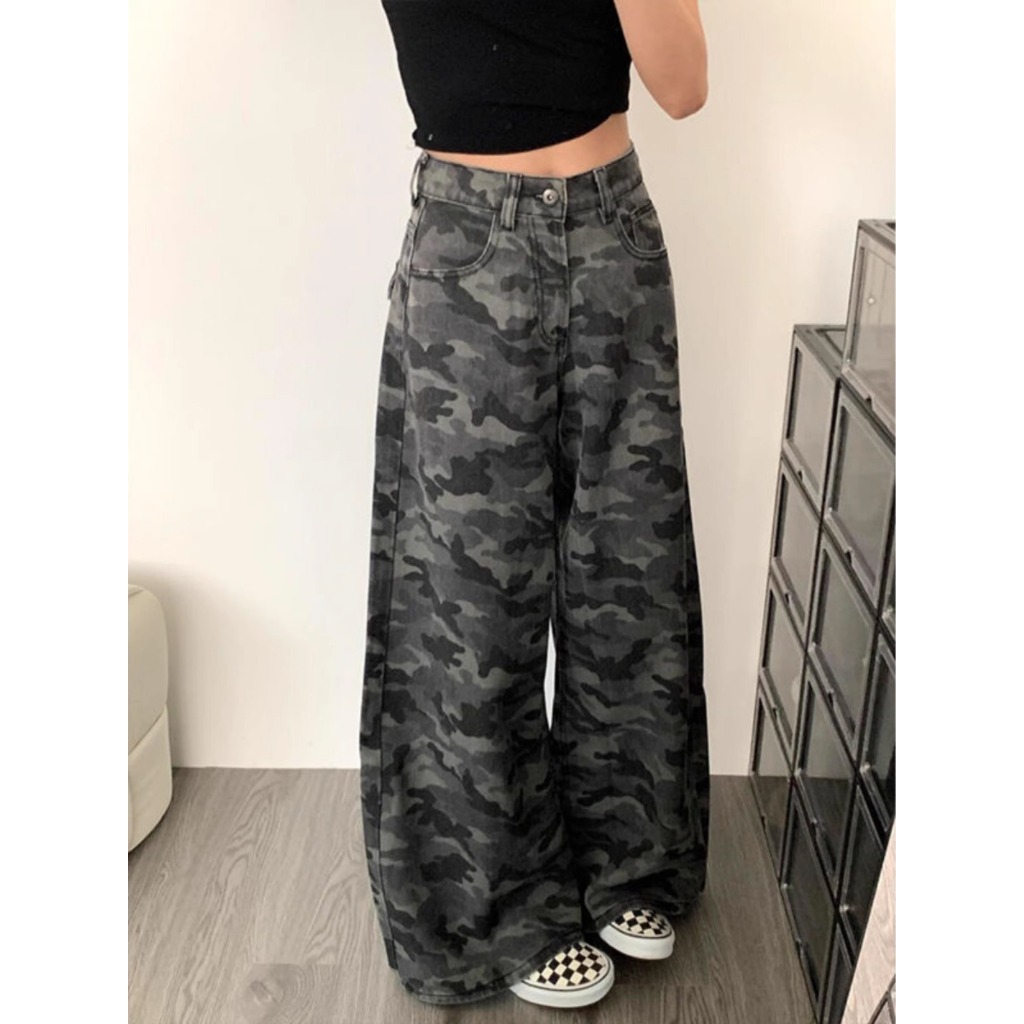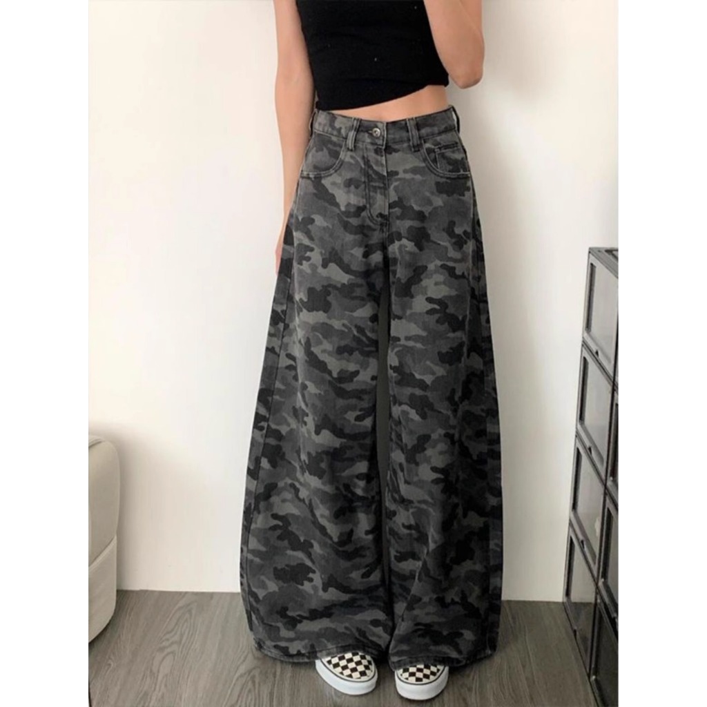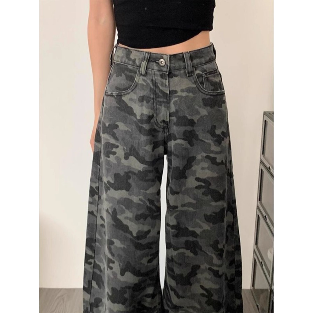 Jeans camouflage kaki lebar street style Highwaist kulot loose jeans cutbray jeans hijau army wanita import