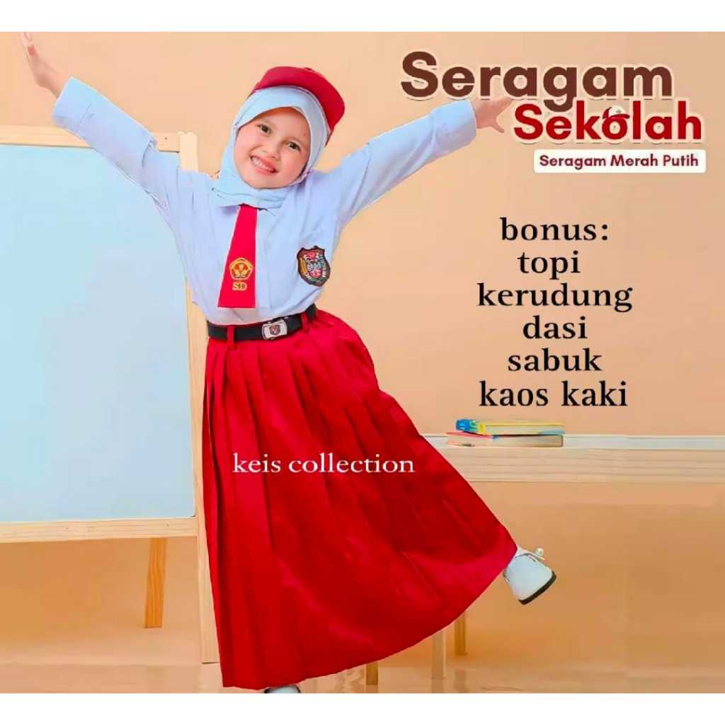 Setelan Seragam Sekolah SD Anak Perempuan Kelas 1-6 | Seragam SD Merah Putih Best Quality Bonus Aksesoris Lengkap