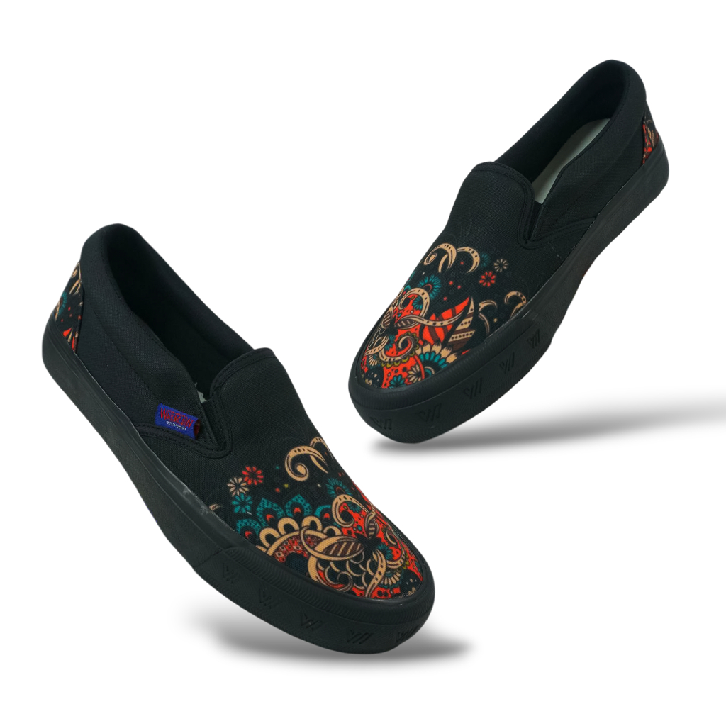 Wakacaw - Sepatu Slip On Batik Etnik All Black Sepatu Sneakers Slip On Pria Dan Wanita
