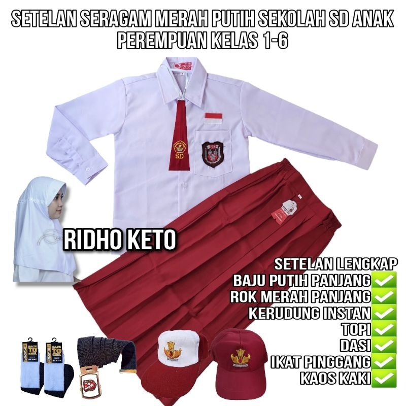 setelan seragam merah putih sekolah SD anak perempuan baju lengan panjang rok merah panjang lengkap