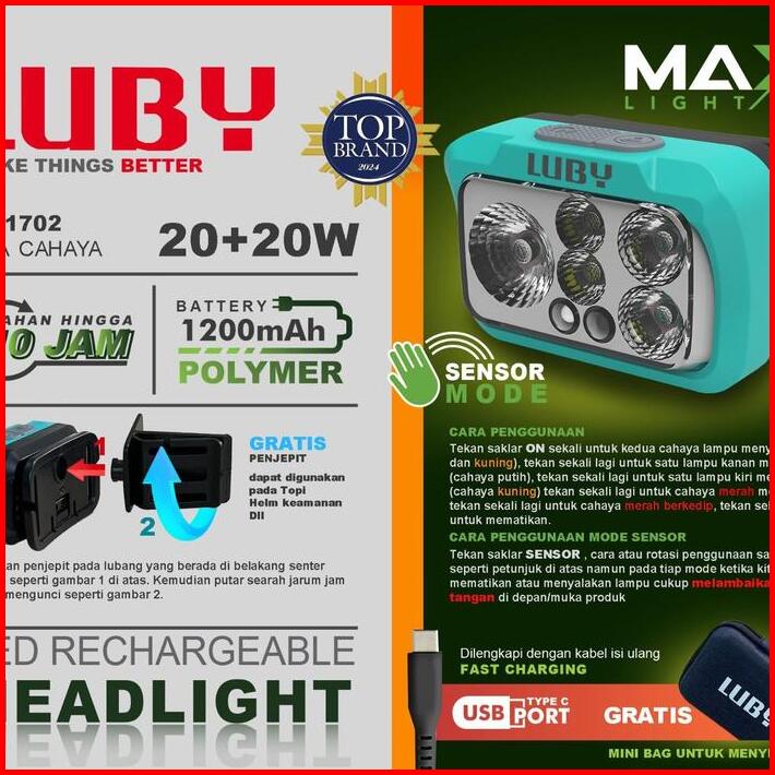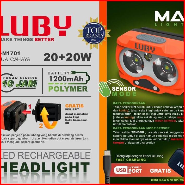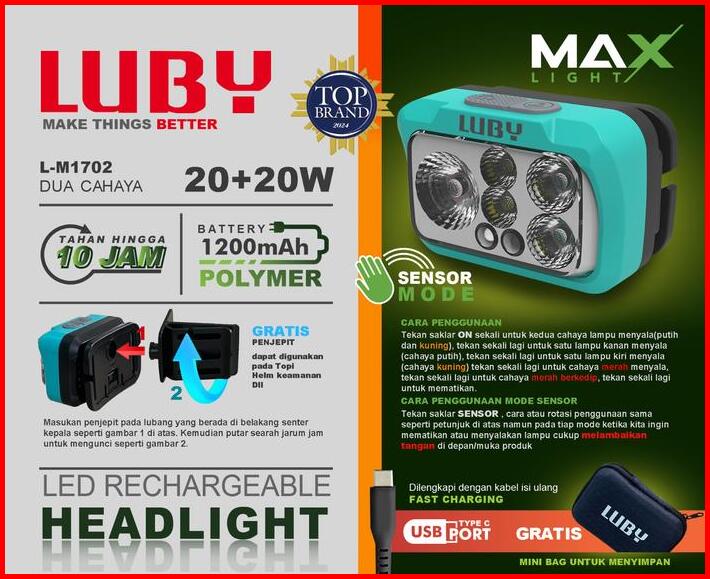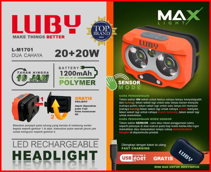 Senter Kepala Led 20watt 20watt Luby L-m1701 Battery 1200mah Tahan Hingga 10jam