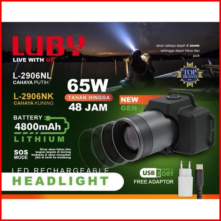 Senter Kepala Luby L-2906nl 65watt 4800mah Led Laser Zoom Out Waterproof Ipx6
