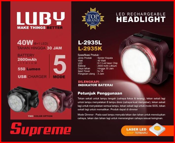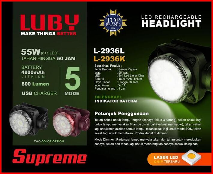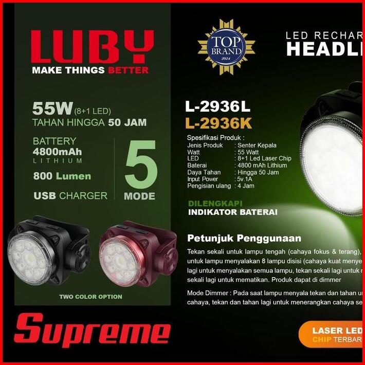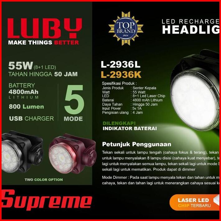 Senter Kepala Led 55watt Luby L-2936l Battery 4800mah Tahan Hingga 50jam