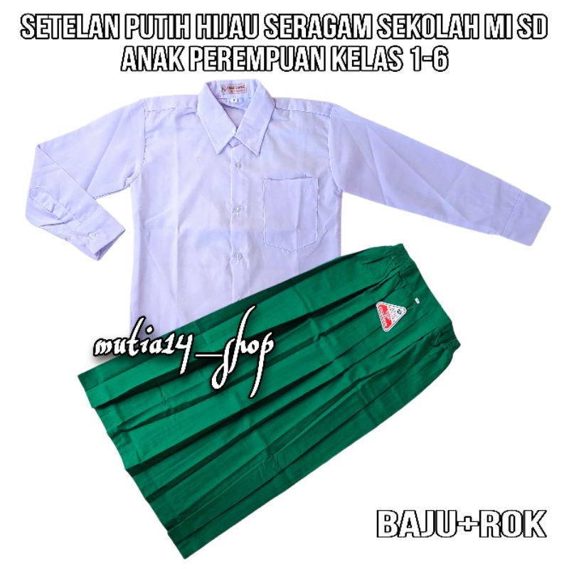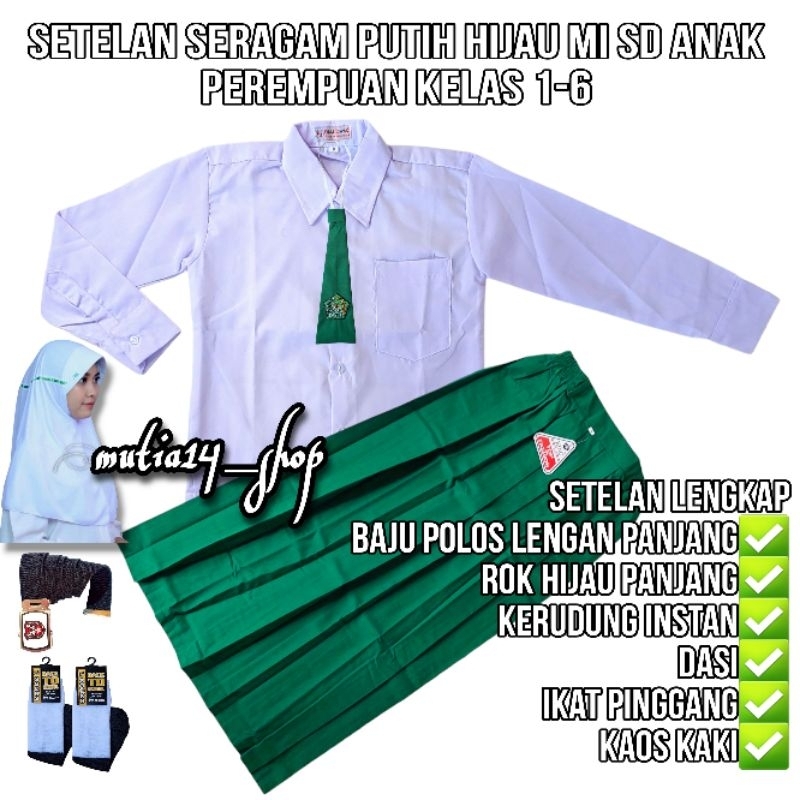 setelan seragam sekolah SD/Mi putih hijau perempuan lengan panjang rok hijau panjang / paket lengkap seragam kelas 1-6 SD