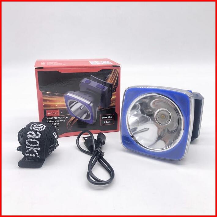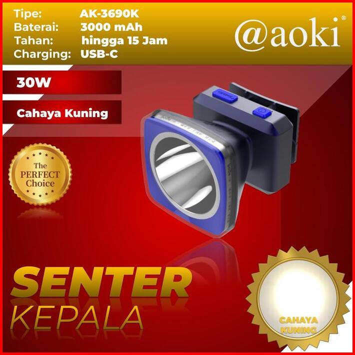 Aoki Senter Kepala 30w Cahaya Kuning Usb Type C Baterai Lithium Tahan Hingga 15jam Lampu