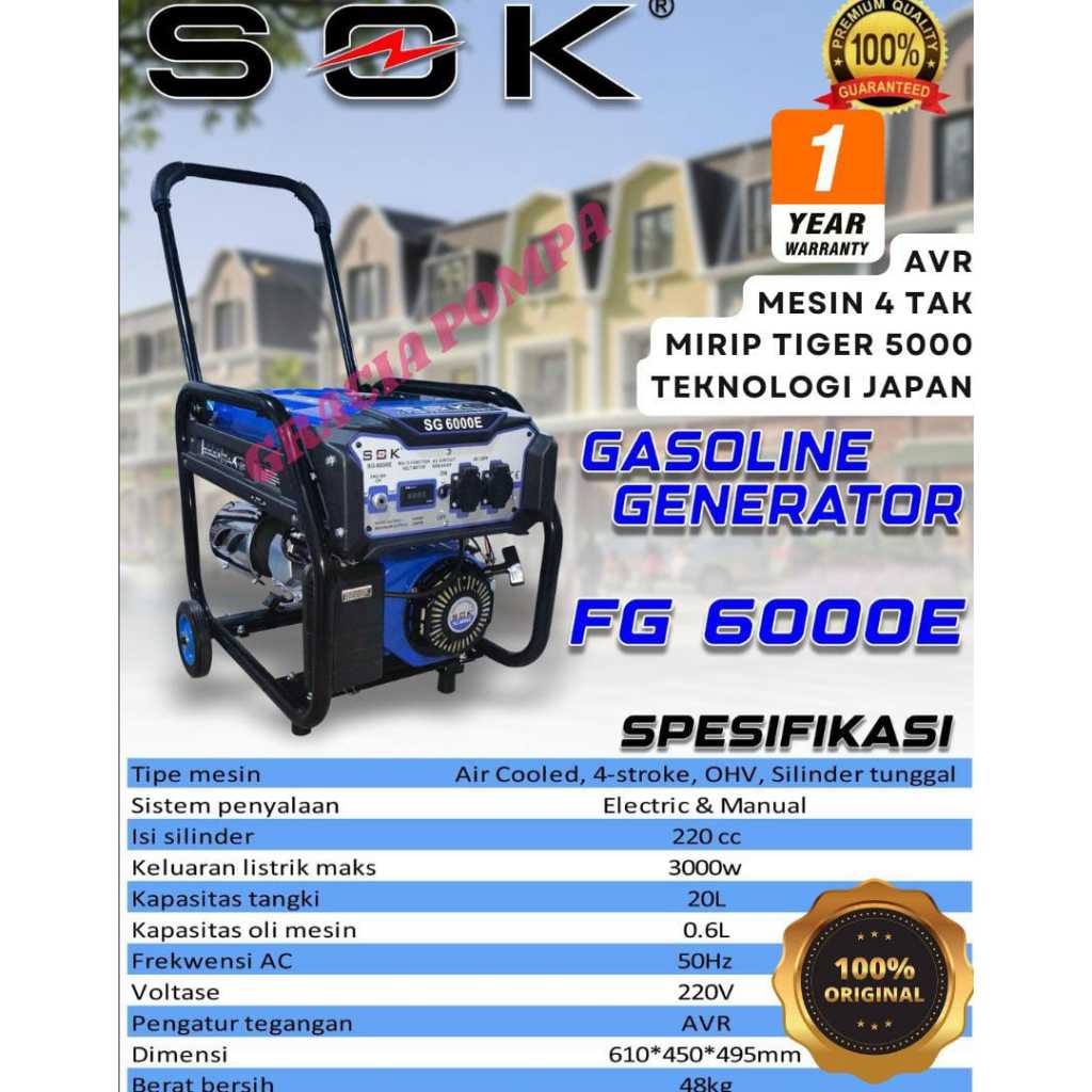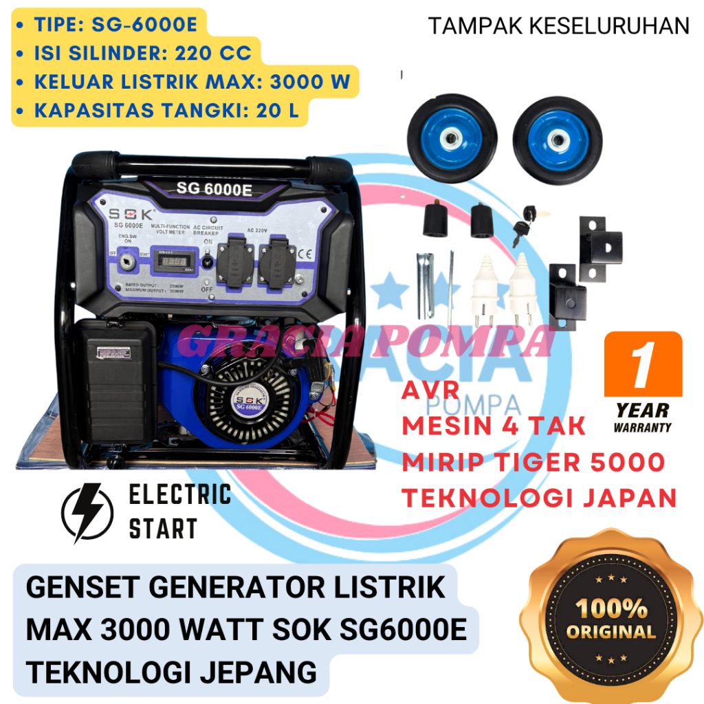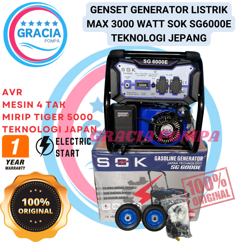 GENSET GENERATOR LISTRIK MAX 3000 WATT SOK SG6000E TEKNOLOGI JEPANG ORIGINAL BERKUALITAS - GRACIA POMPA