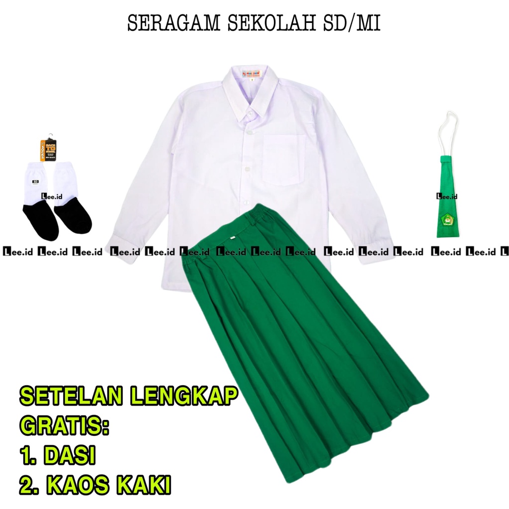 Seragam Sekolah SD MI Setelan Lengkap Putih Hijau Perempuan Baju Putih Polos Panjang Rok Hijau Panjang Kelas 1 – 6 SD