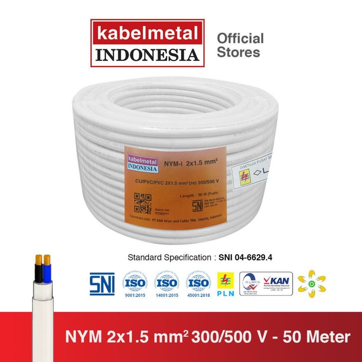 Kabel Listrik 50 Meter Kabel NYM 2x1.5 mm 50 Meter Roll kabelmetal INDONESIA - Kawat Tembaga Tunggal PVC Putih Listrik