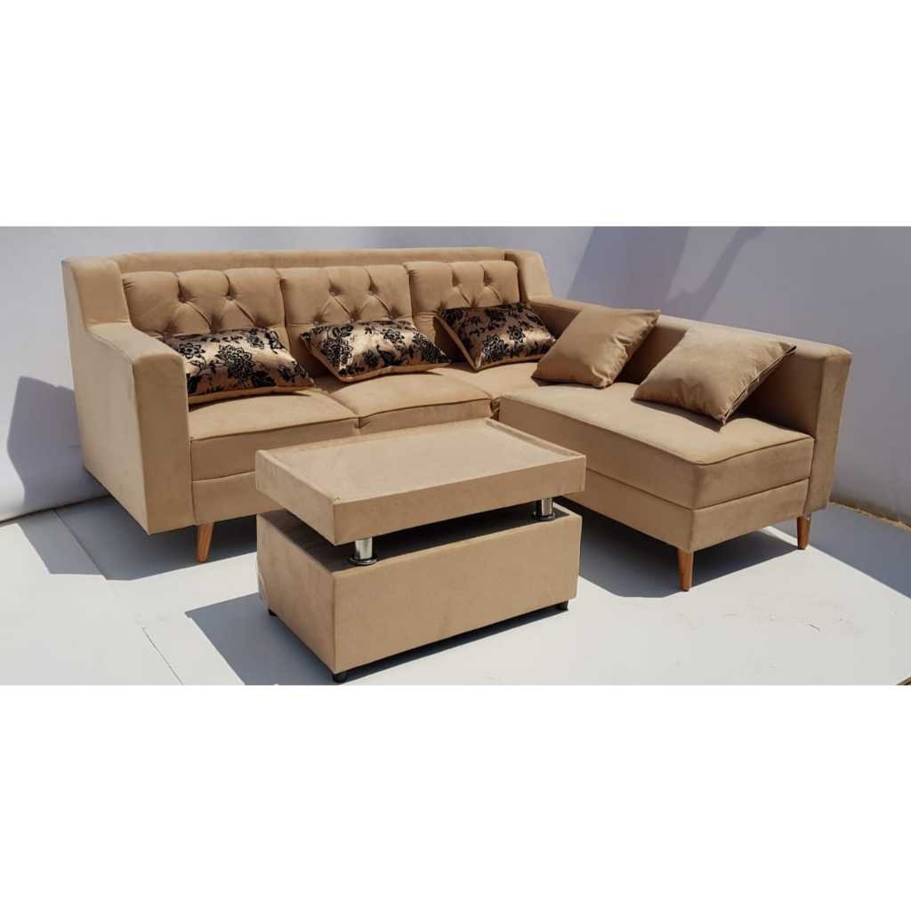 Sofa L Minimalis Kaki Retro + Meja kain daphnie model alexsoy