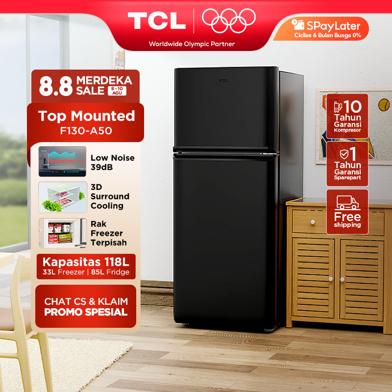 TCL Kulkas 2 Pintu (F130-A50) - Kapasitas 118L - Rak Freezer Terpisah - 3D Surround Cooling - Adjustable shelves - Low Noise 39dB - Metal Panel - Kulkas Mini - Lemari Es - Kulkas Kecil Kamar