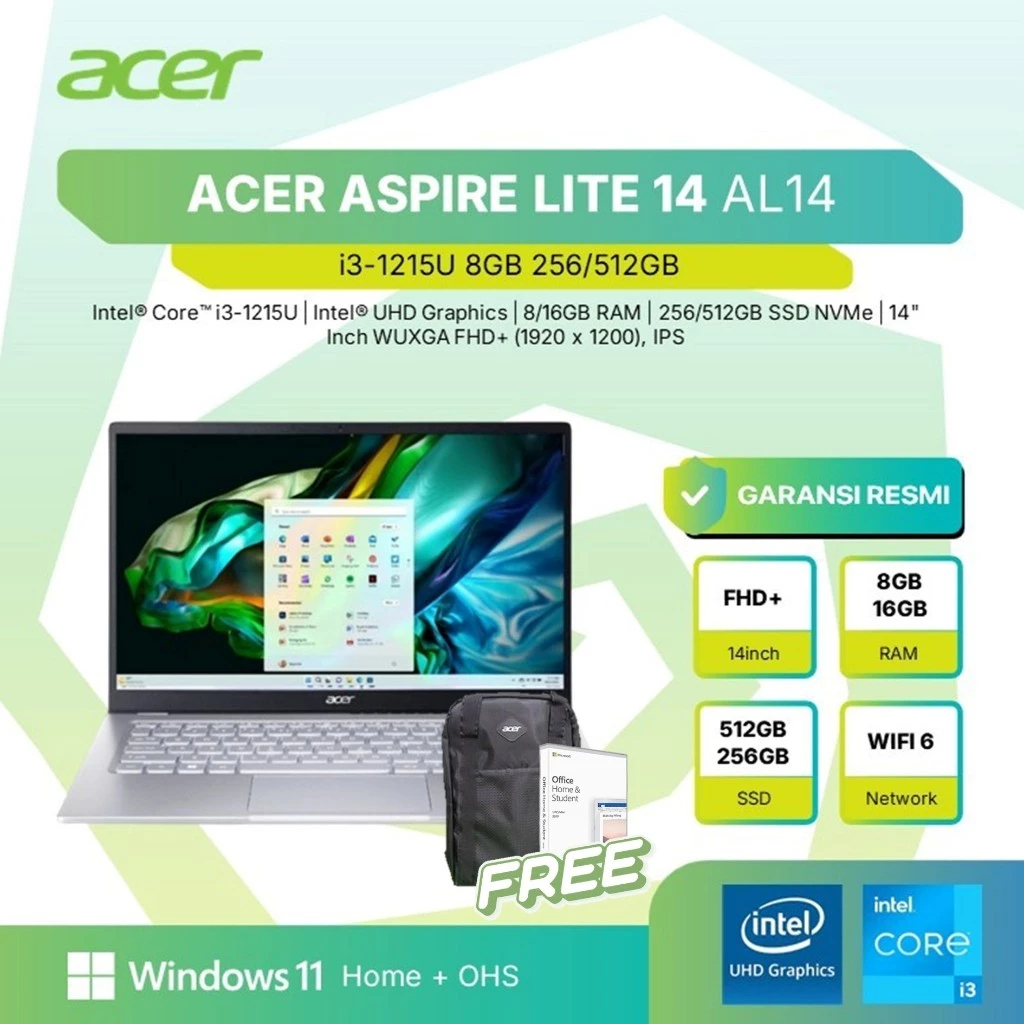 LAPTOP ACER ASPIRE LITE AL1-14M-RBID INTEL CORE i3-1215 RAM 8GB STORAGE 256/512GB SSD 14″ WUXGA OFFICE HOME STUDE