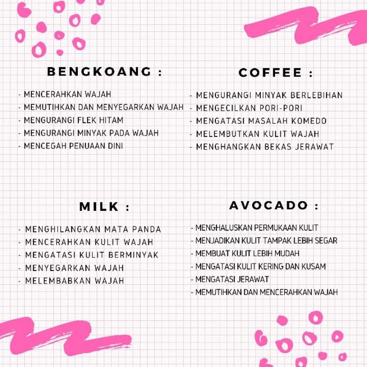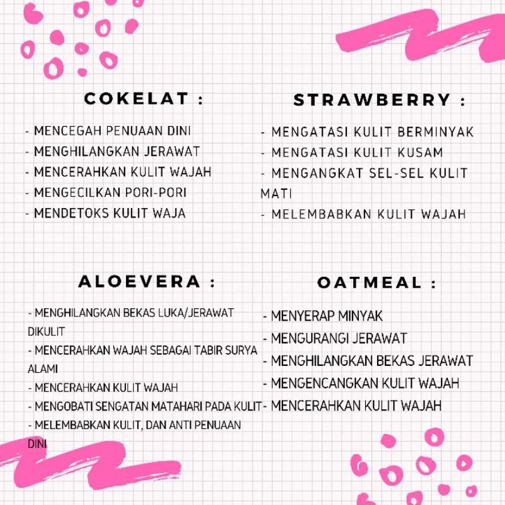 Avocado, Green tea, Aloevera, Banana, Mawar, Charcoal, Oatmeal, Kunyit, Coffe, Coklat, Susu, Strawberry, Lemon, Bengkoang