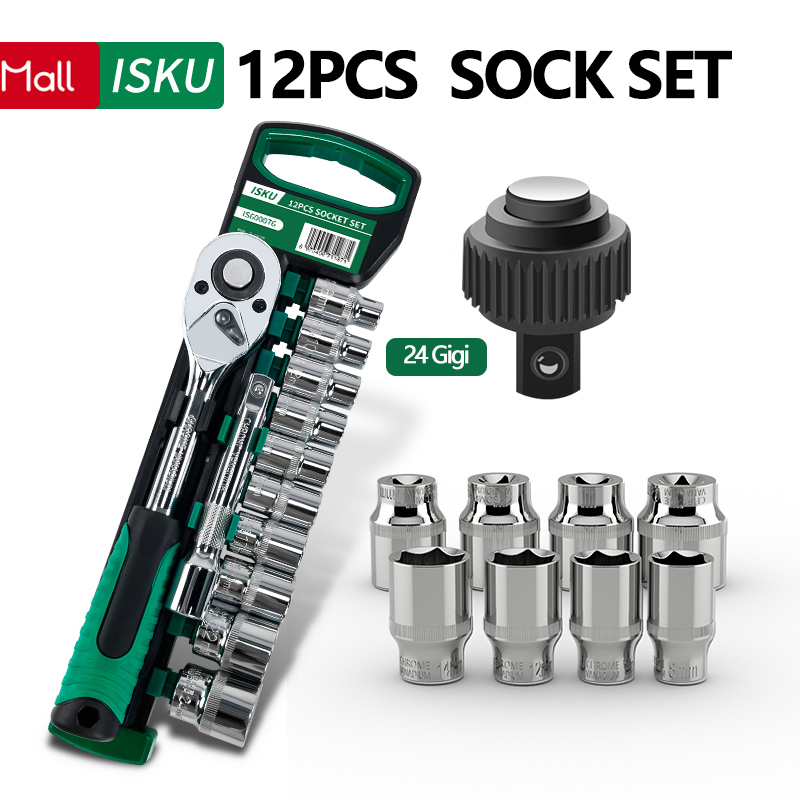 ISKU Kunci Shock 12Pcs Drive Socket 1/2 Inch Socket Wrench Set 8-24mm Dan 10Inch Extension Bar Bahan Chrome Vanadium