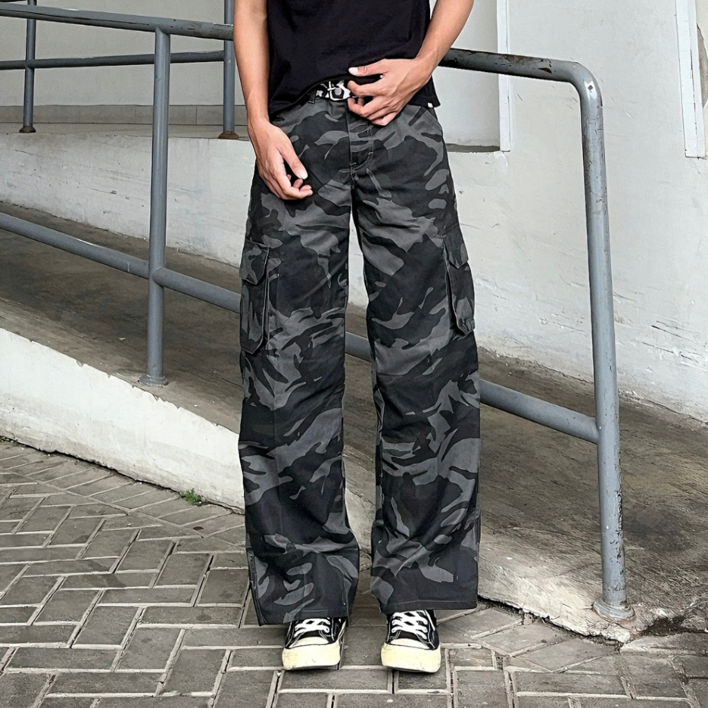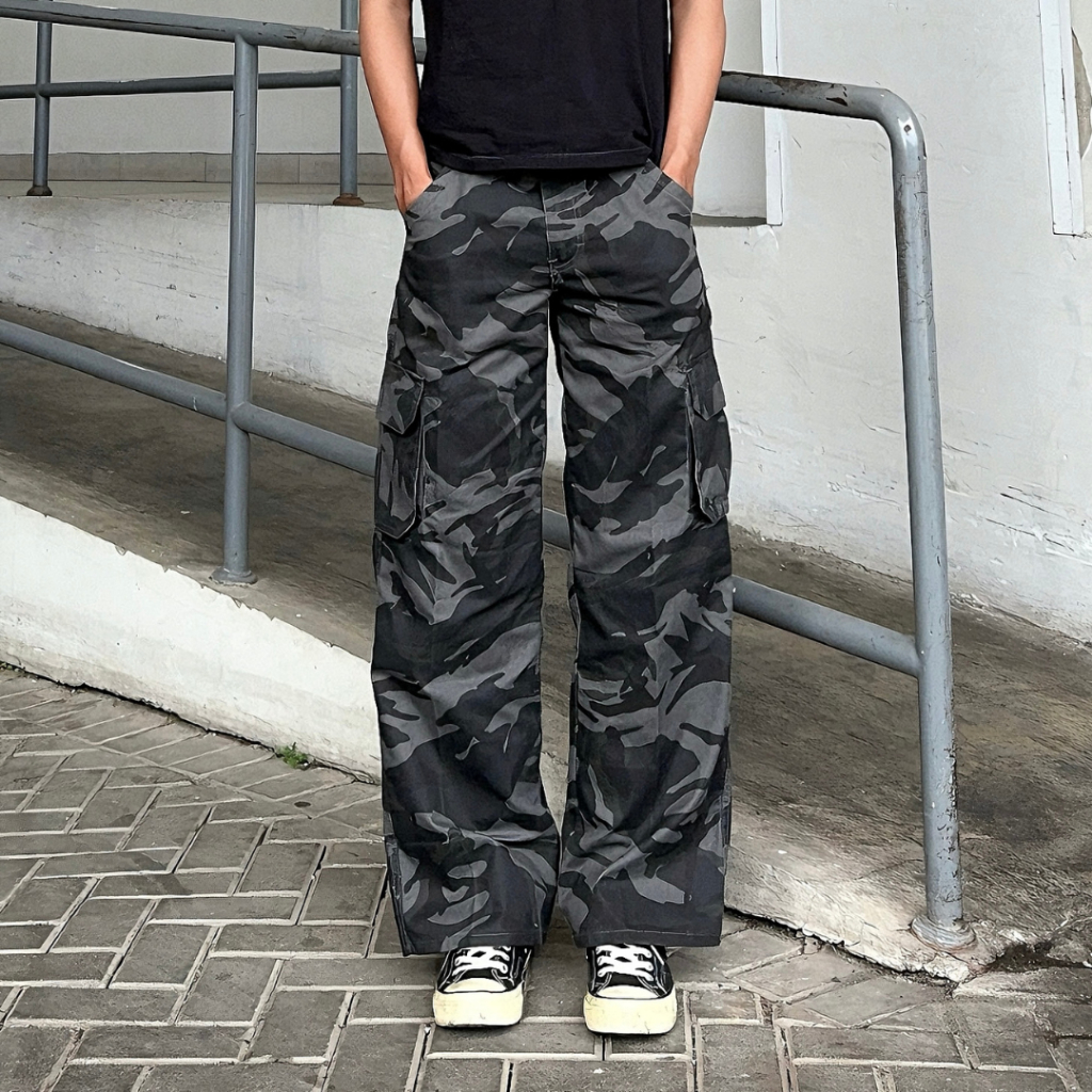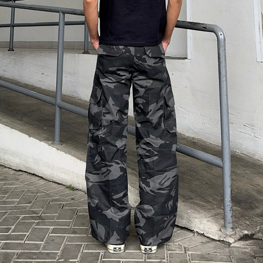 FIFTEEN DENIM - Celana Cargo Panjang Loose Camo Army Loreng Dark Grey Camo Cargo Pants Camo