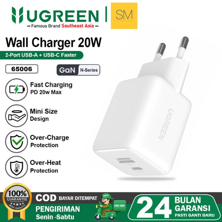 UGREEN Kepala Charger Dual Port USB A + USB Type C Fast Charging 20W | 65006 | GaN Fast Charger