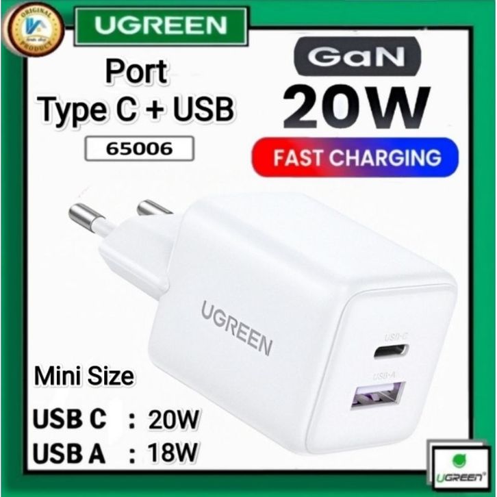 UGREEN Kepala Charger Casan type C + USB Gan 20W Faat Charging