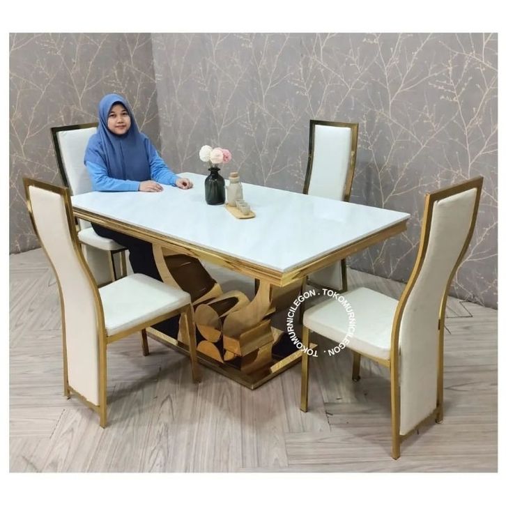 Meja Makan Marmer Kaki Tengah Gold 6 Kursi Fuji ( cilegon serang kota)
